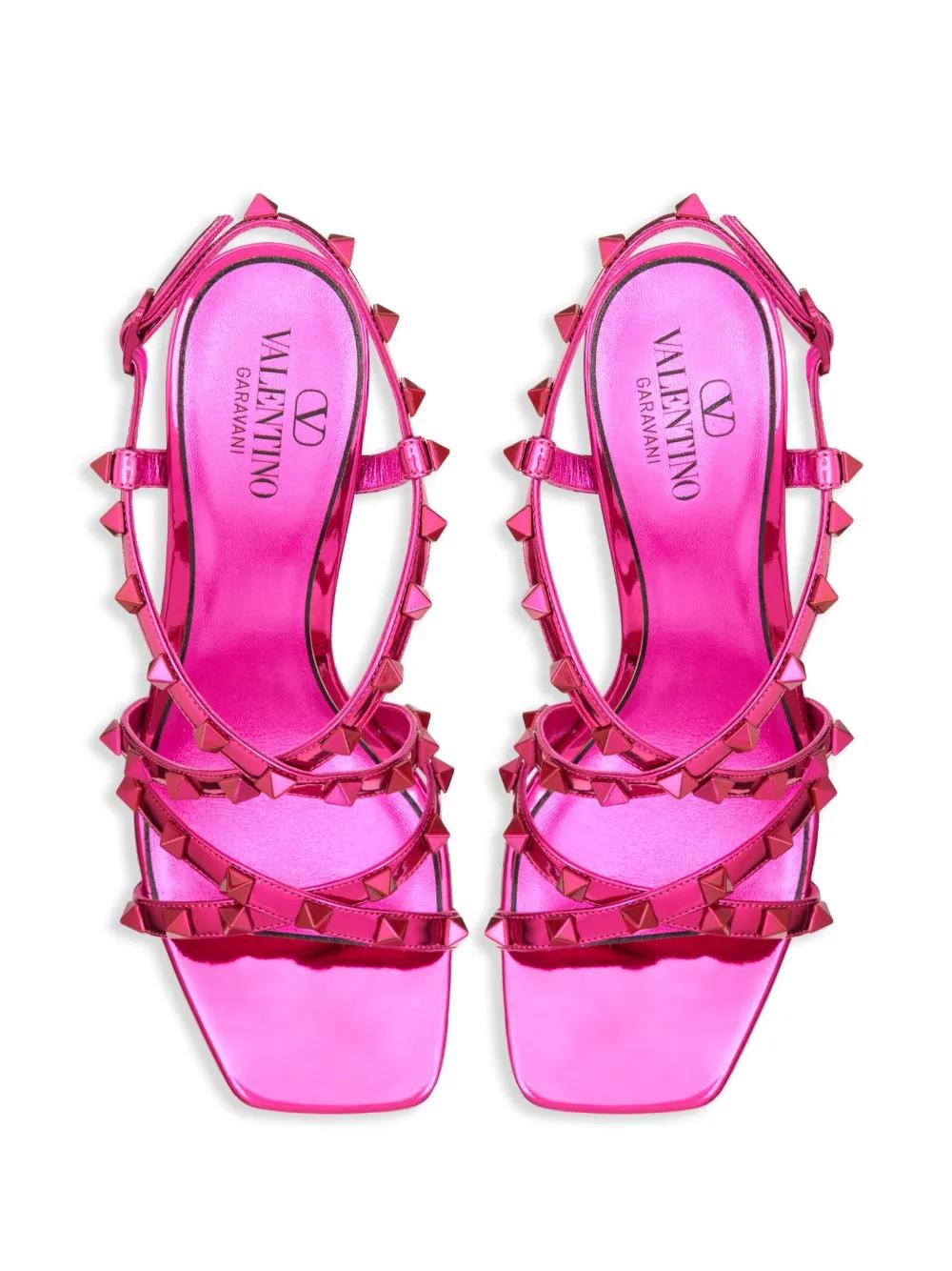 fuchsia pink leather metallic finish signature Rockstud detailing open toe crossover strap detail buckle-fastening ankle strap 100mm stiletto heel branded leather insole leather outsole