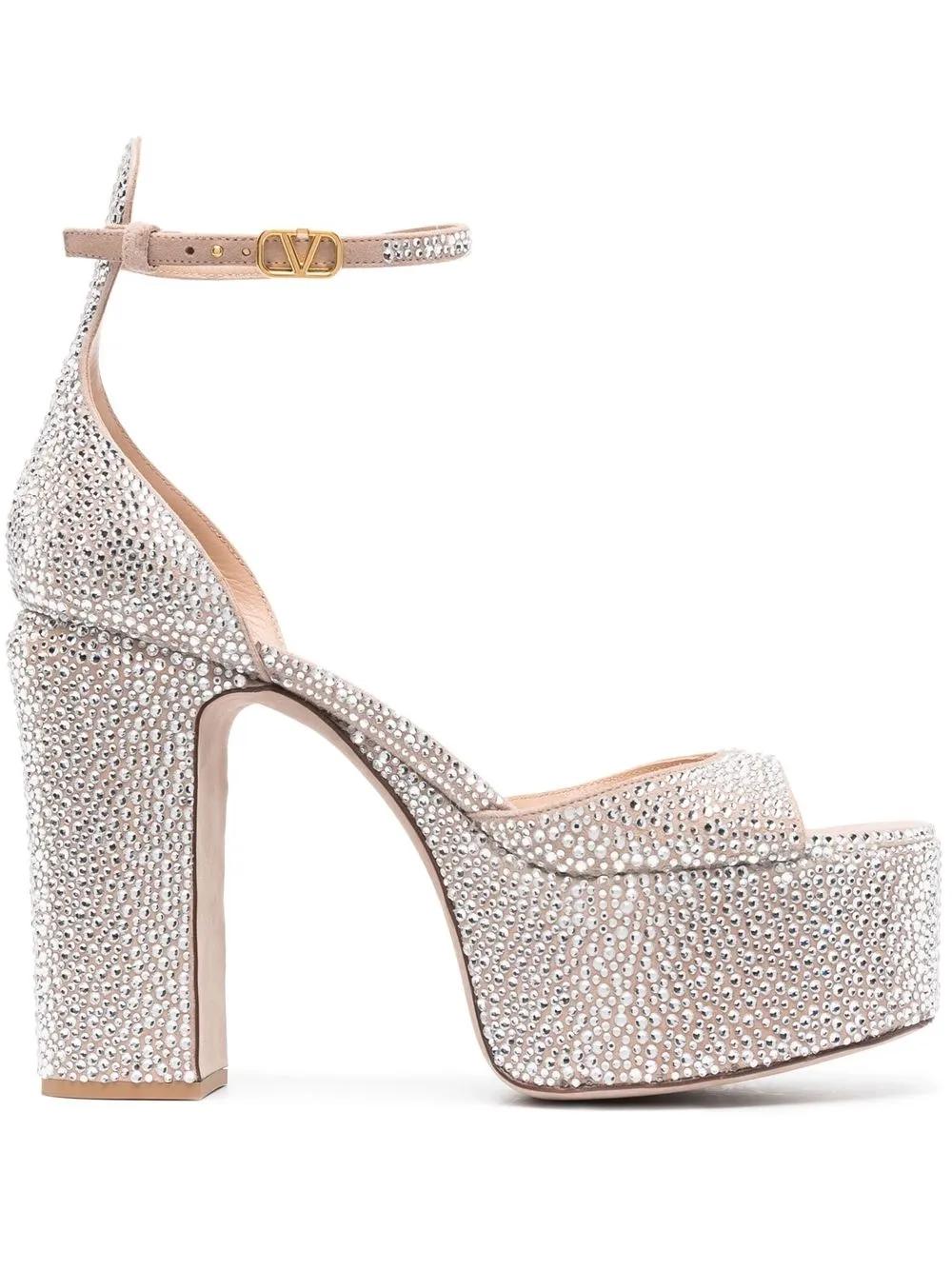 powder pink calf leather crystal embellishment VLogo Signature open toe buckle-fastening ankle strap branded leather insole platform sole high block heel