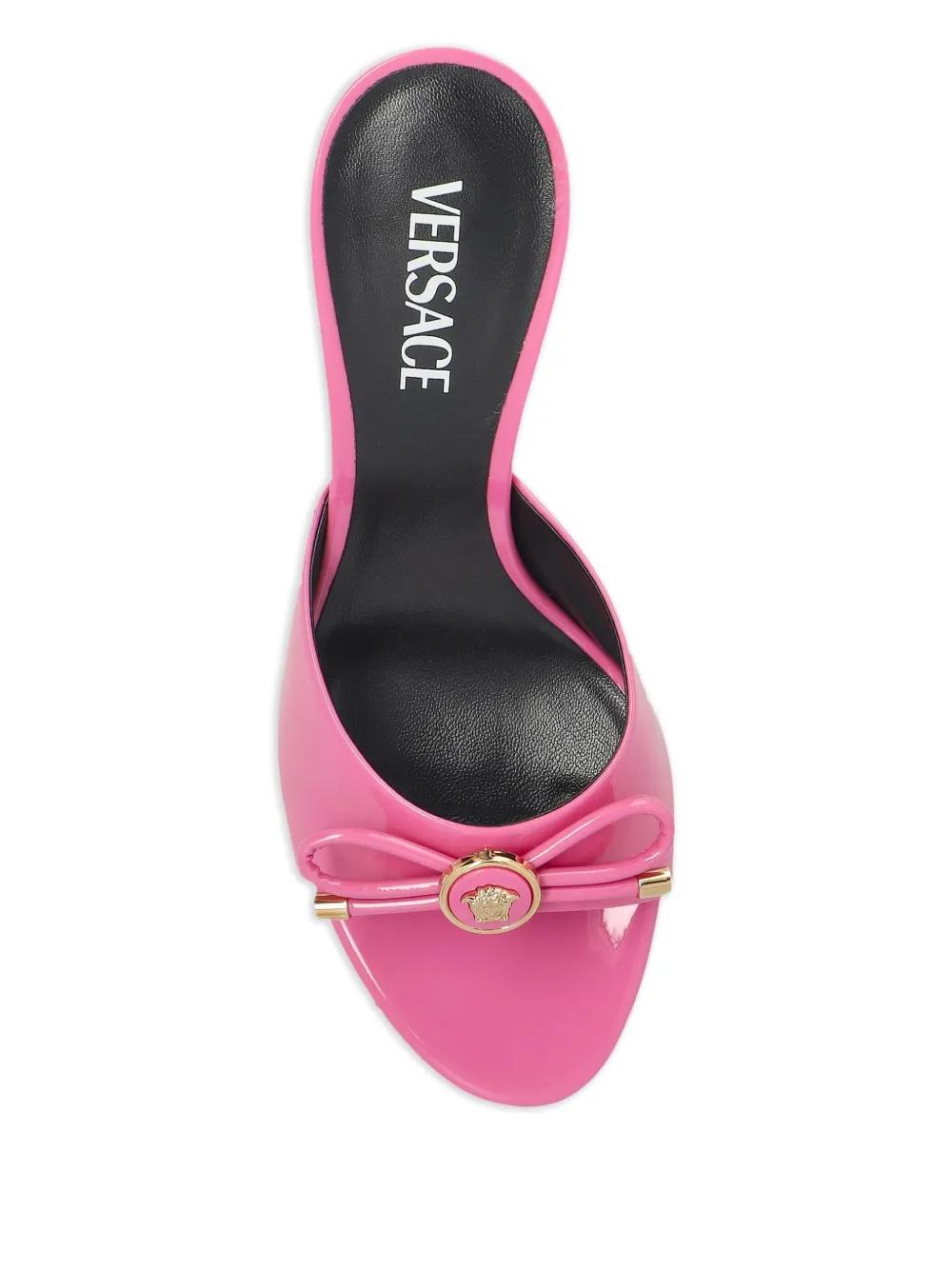 pink leather patent finish 85mm high heel open toe bow detail signature Medusa Head emblem