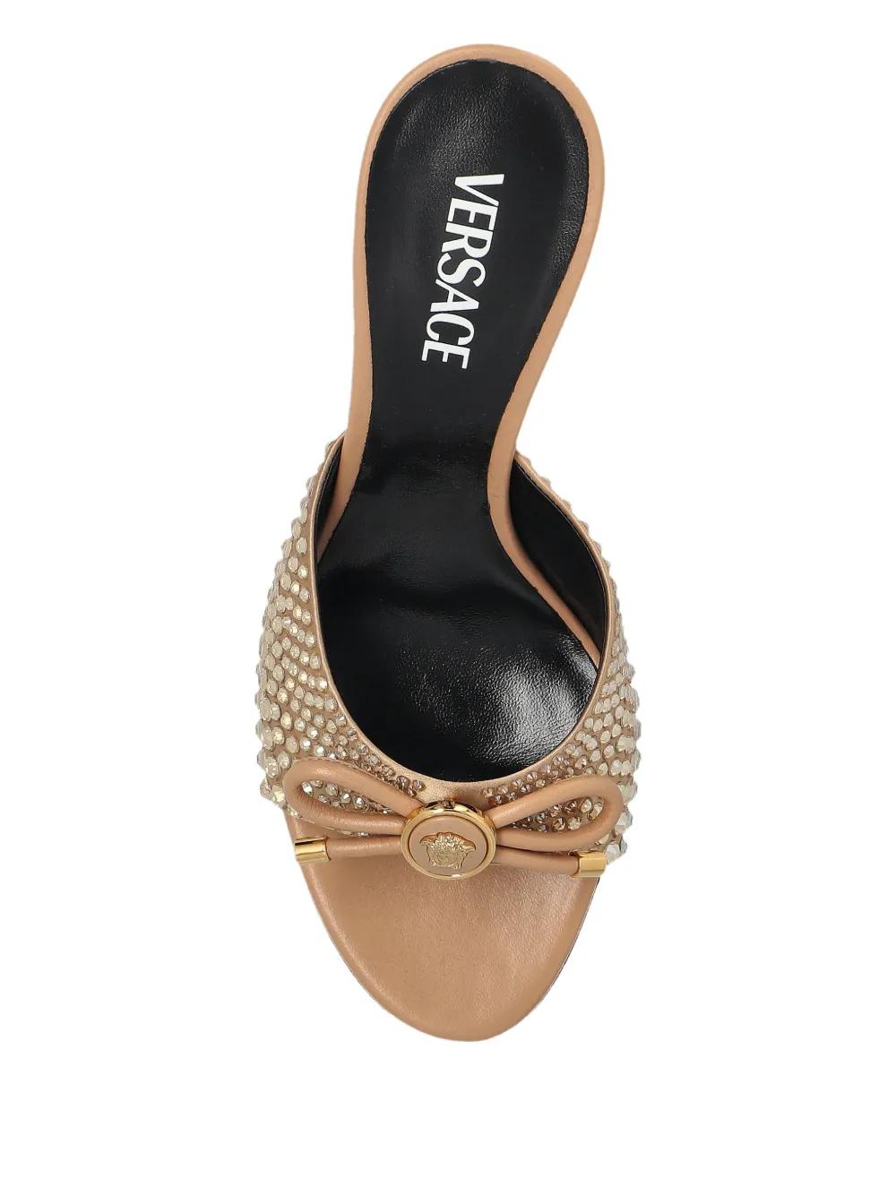 brown embellished upper bow detail open toe stiletto heel branded insole