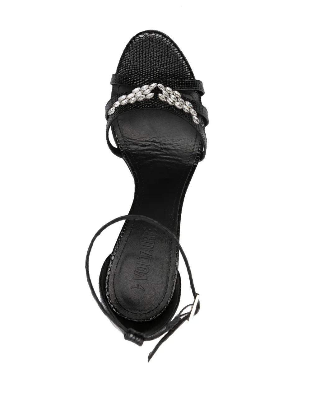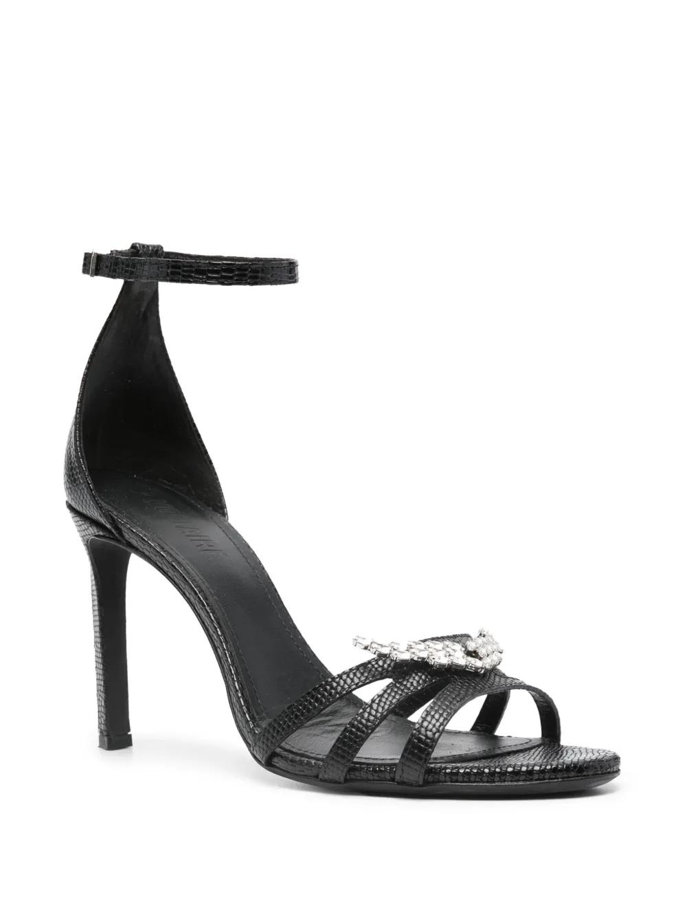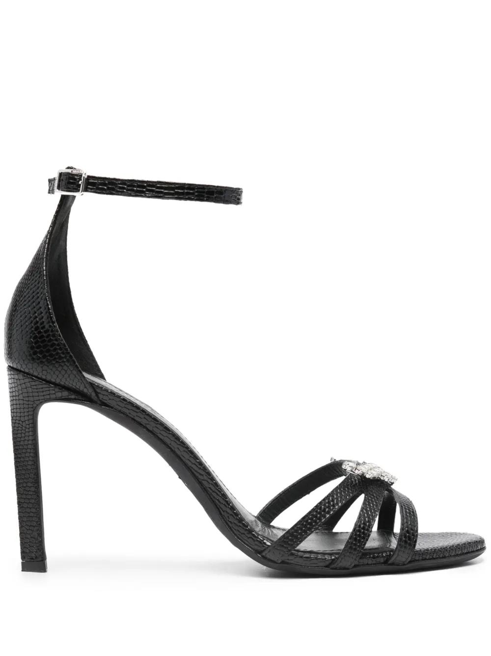 black calf leather snakeskin effect crystal embellishment logo plaque strap detailing open toe buckle-fastening ankle strap branded leather insole 90mm high heel leather sole