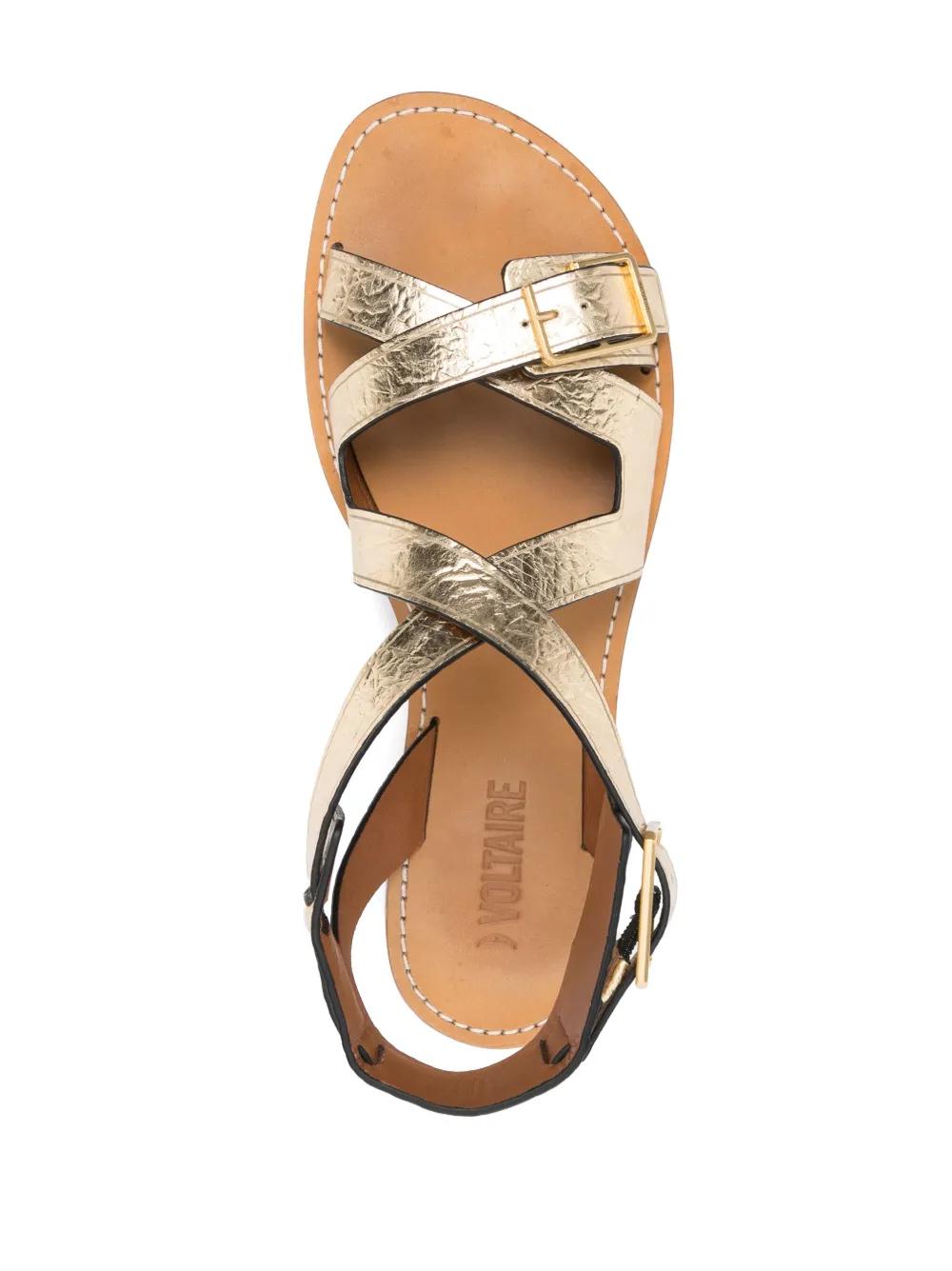 gold-tone metallic finish crinkled finish open toe crossover strap at the toe double buckle fastening branded footbed flat sole