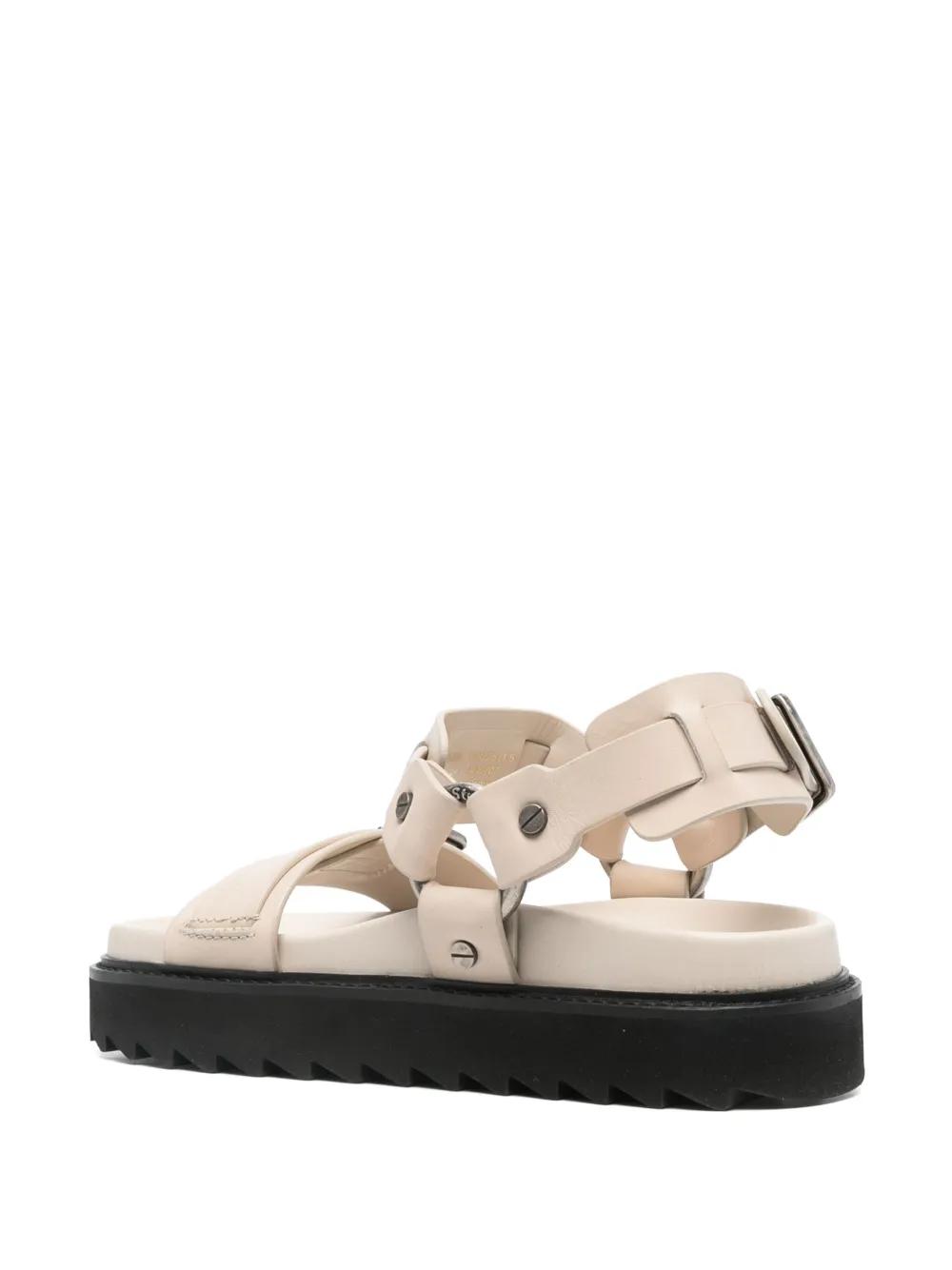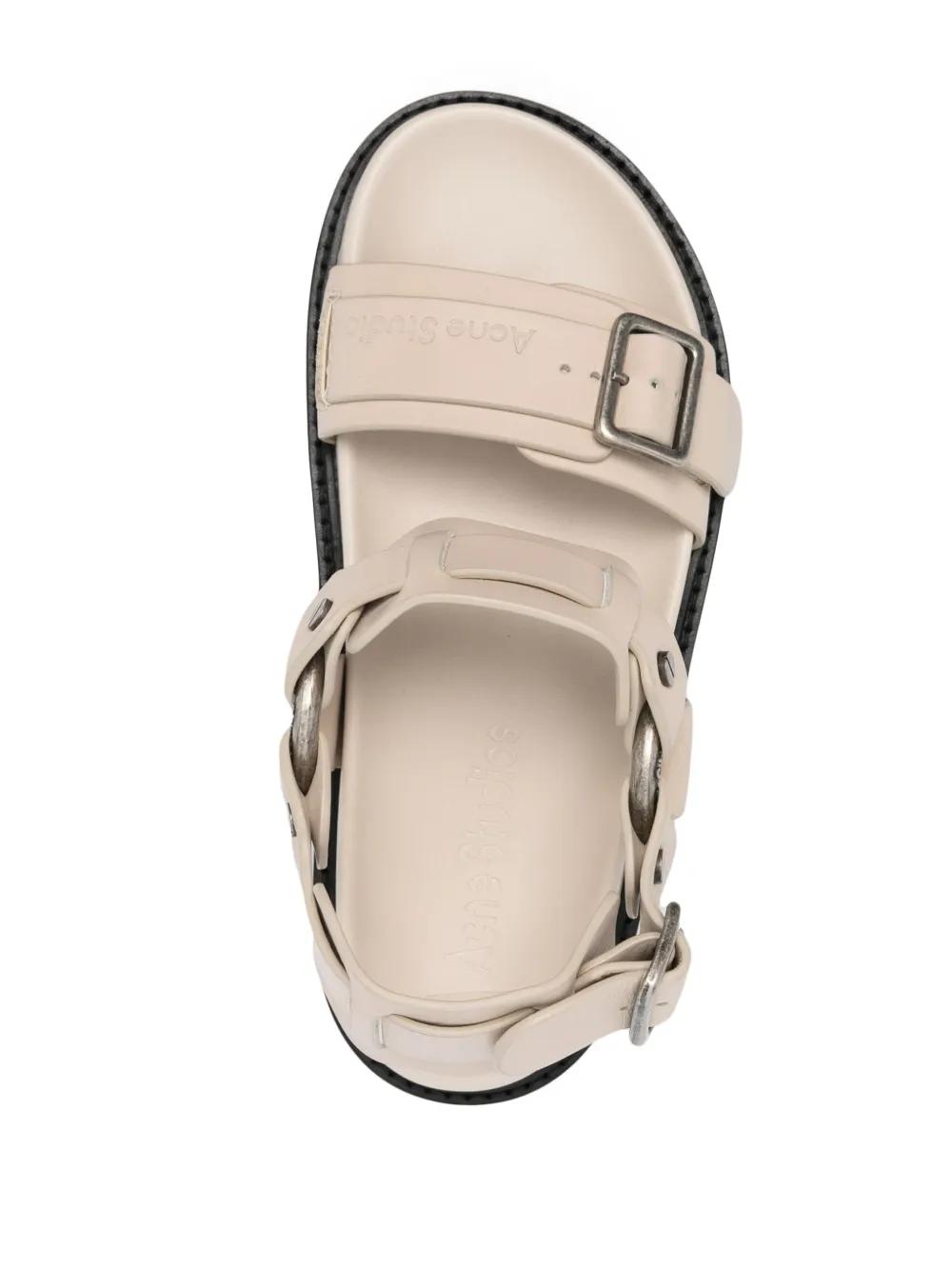 beige calf leather logo-debossed strap buckle-strap fastening ring hardware detailing branded insole rubber sole almond open toe