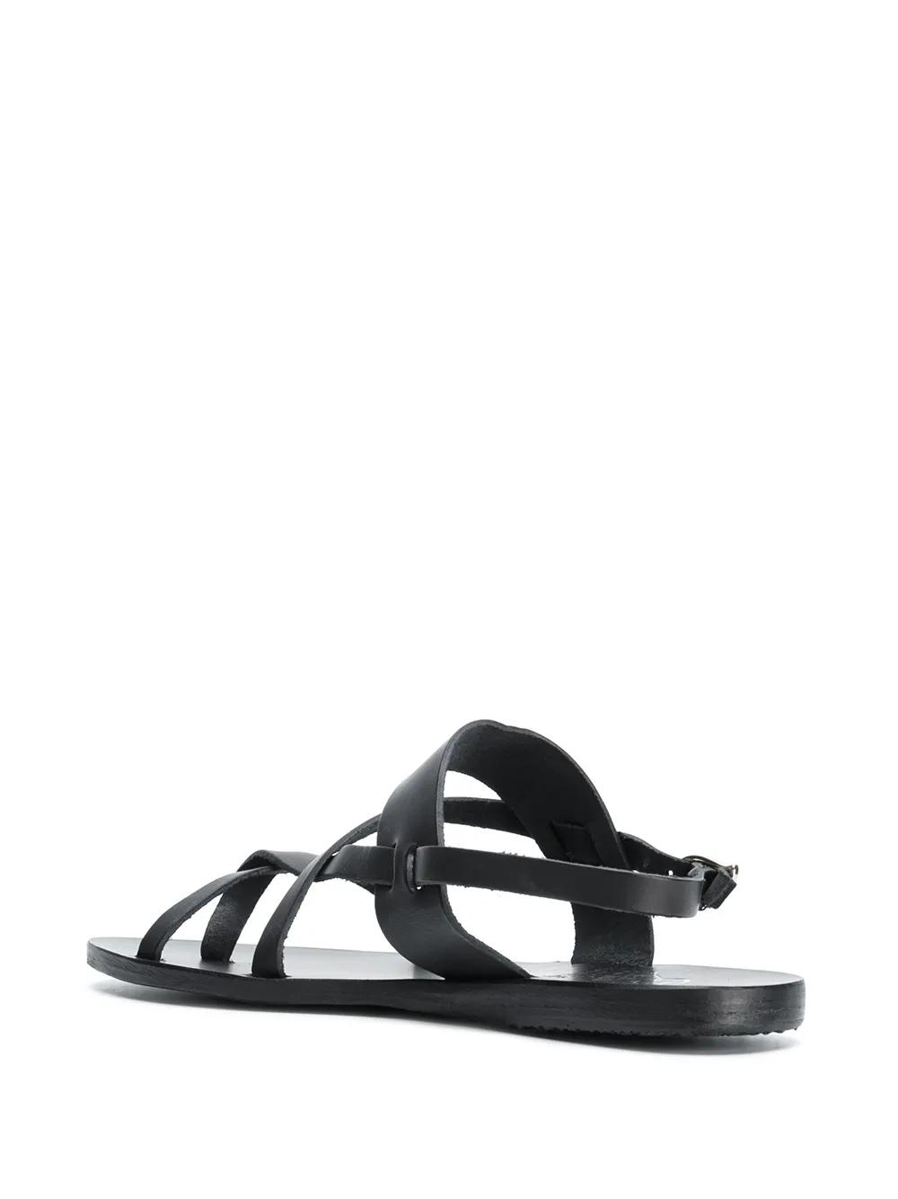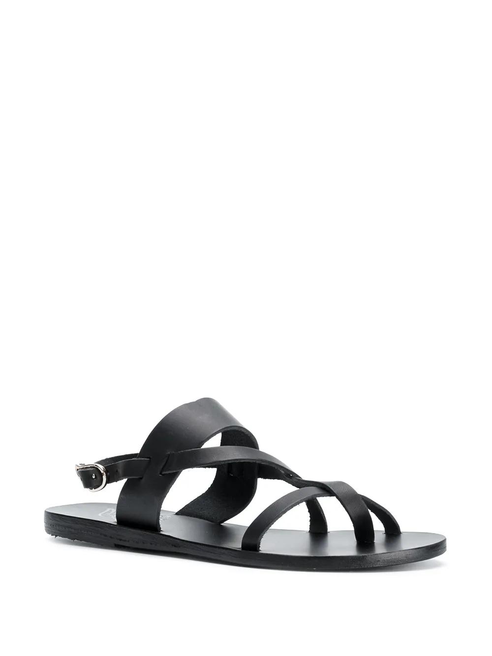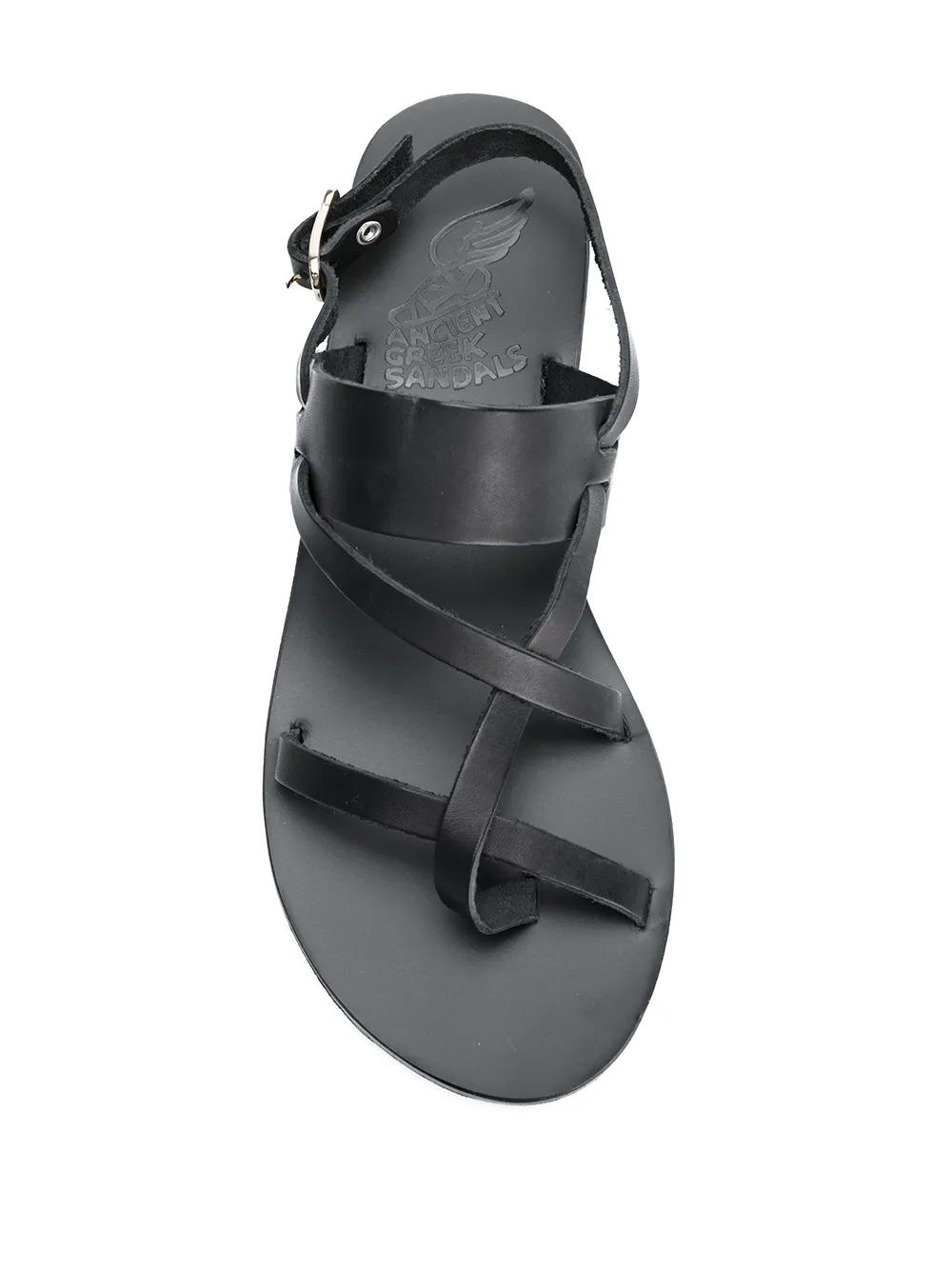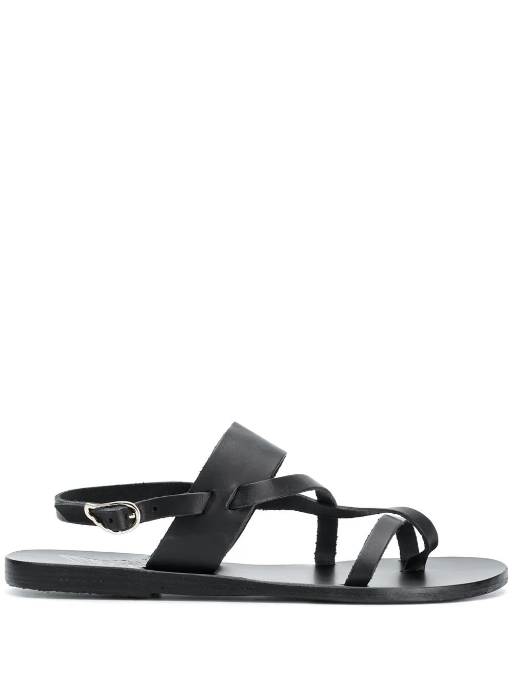 Black leather and bos taurus Alethea flat sandals from Ancient Greek Sandals. POSITIVELY CONSCIOUS: Ancient Greek Sandals scores 3 out 5 by independent ethical brand rating agency Good On You. It manufactures locally to reduce its carbon footprint, uses low impact non-toxic dyes and visits suppliers regularly in its supply chain.