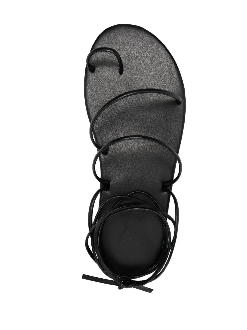 black calf leather multi-way strap design open toe round toe tie-fastening ankle strap flat rubber sole