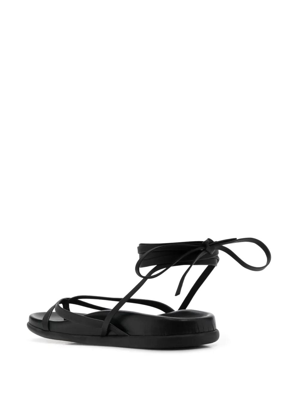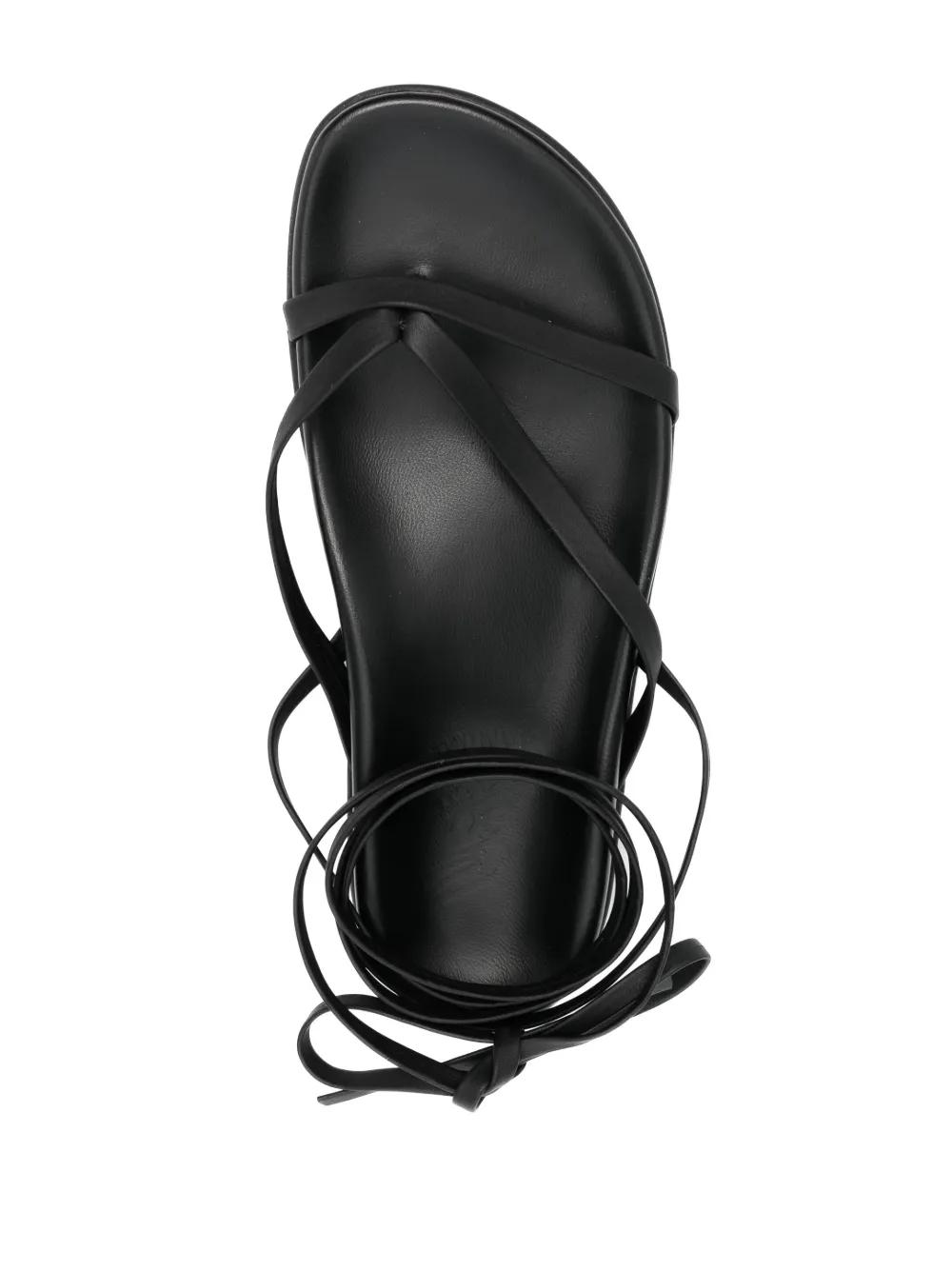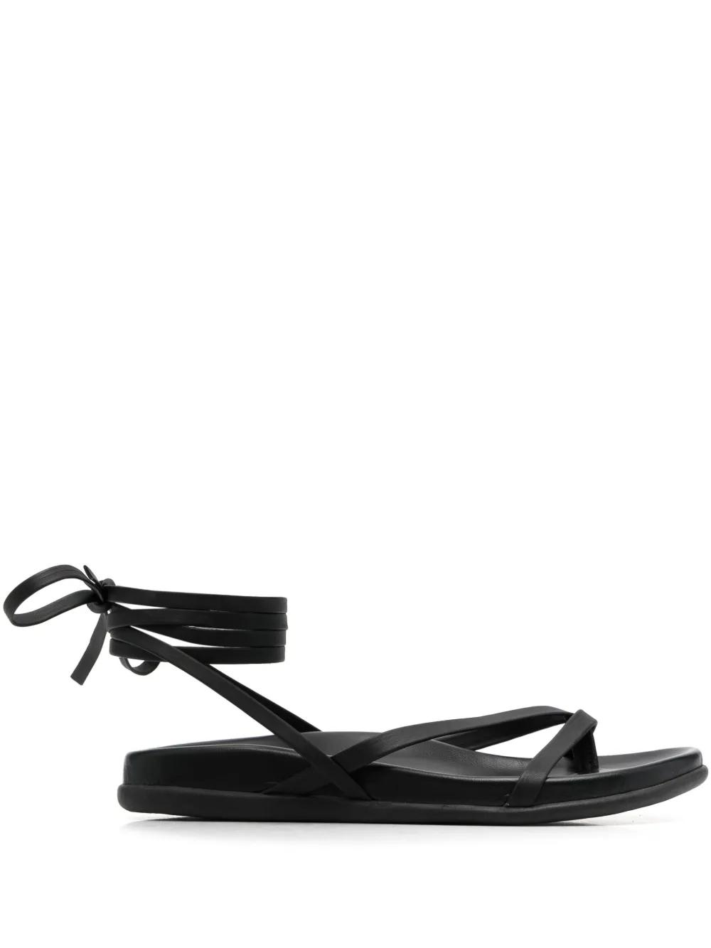 black calf leather open toe tie-fastening ankle strap moulded footbed multi-way strap design flat rubber sole round toe