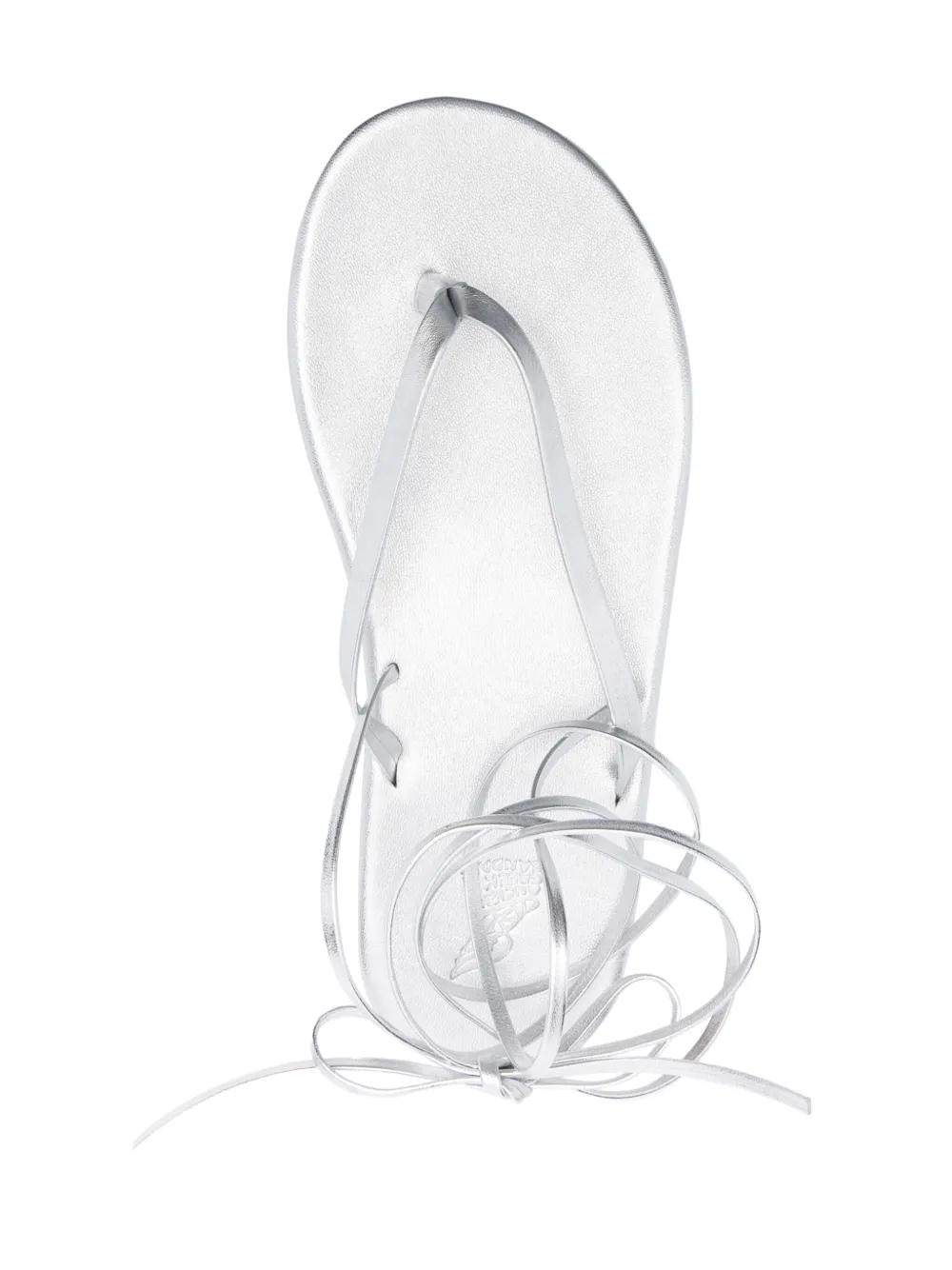 silver-tone calf leather metallic effect almond open toe thong strap branded leather insole flat rubber sole tie-fastening ankle strap