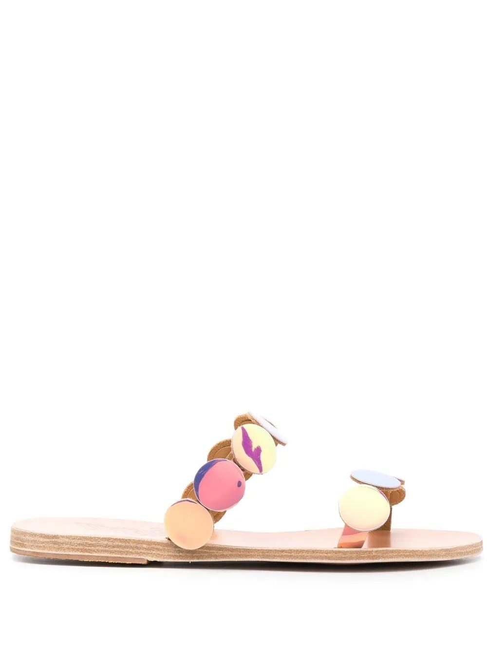 beige calf leather branded leather insole open toe double-strap design flat rubber sole