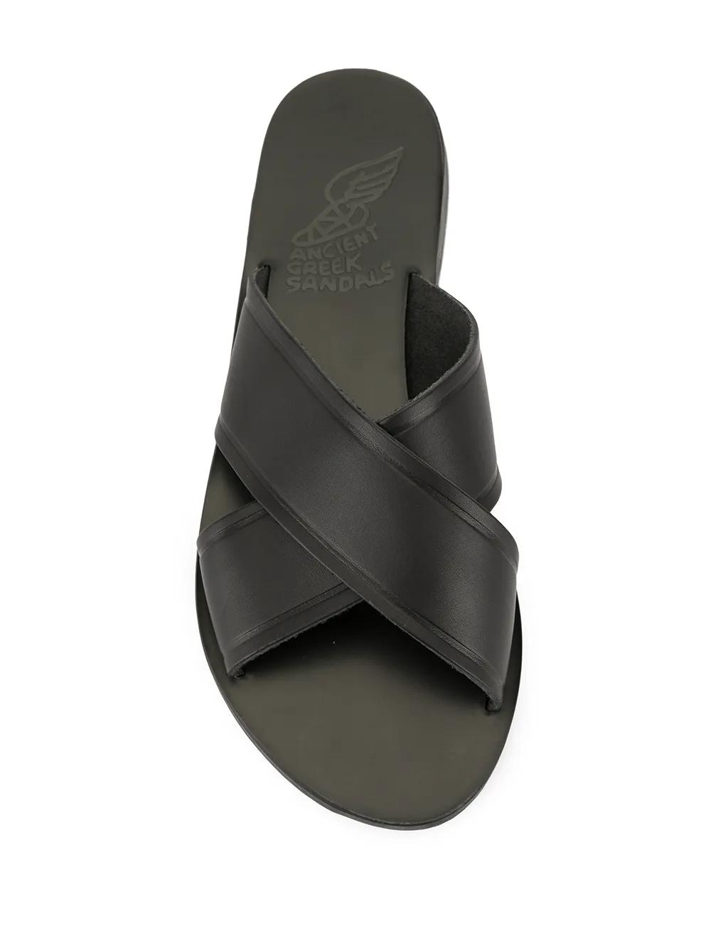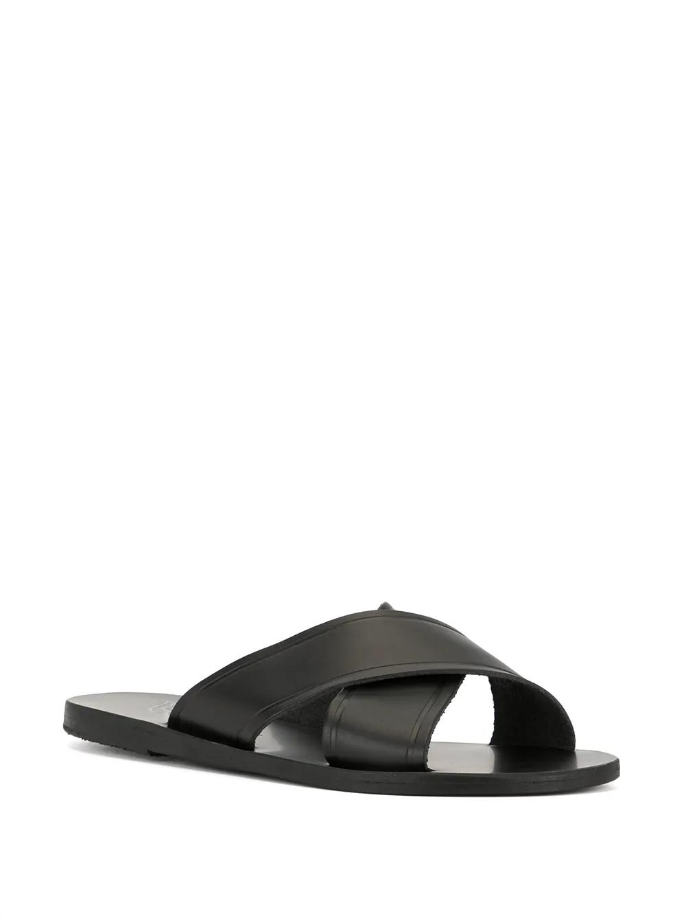 Black leather Thais crossover sandals from Ancient Greek Sandals featuring an open toe, crossover straps to the front, a branded insole and a flat rubber sole.