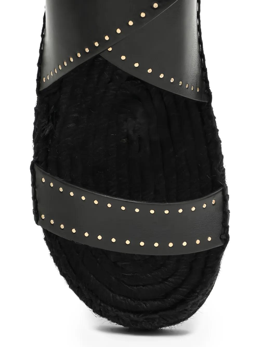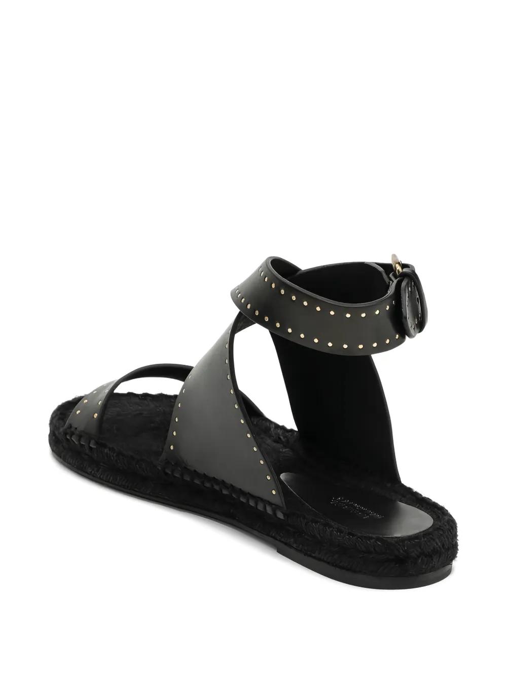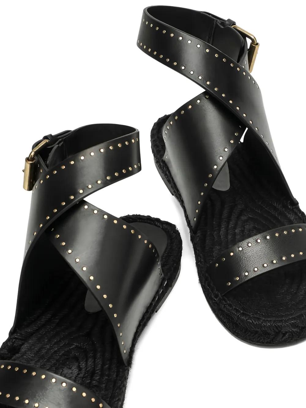 black leather upper gold-tone stud embellishment ankle strap buckle fastening cross-strap design jute sole