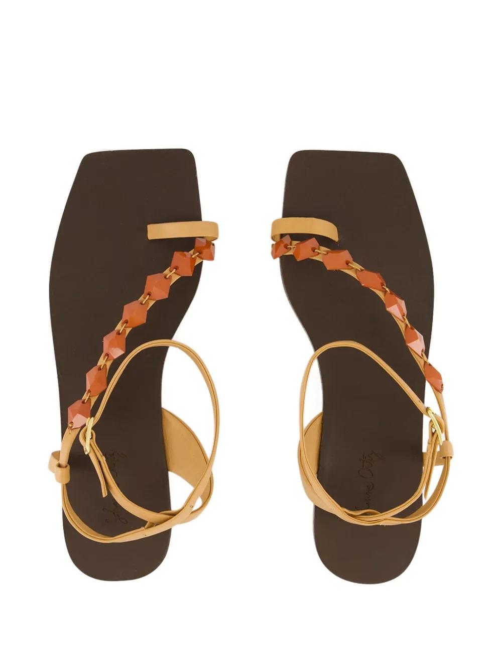 beige leather ankle strap buckle fastening beads embellishment flat sole