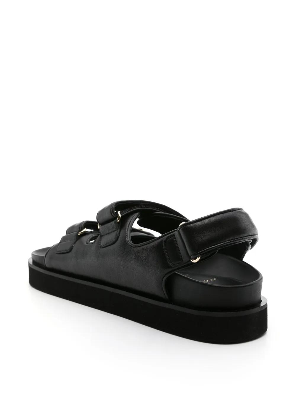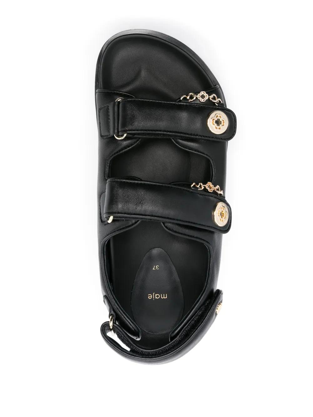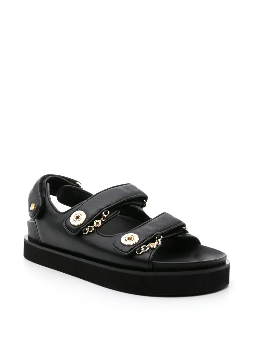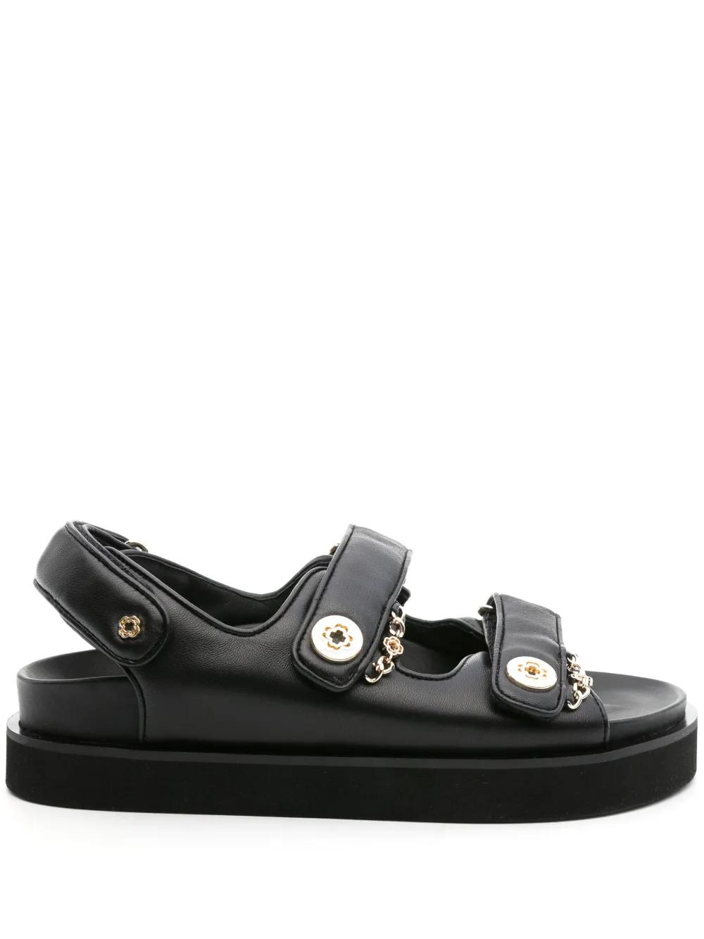 black calf leather gold-tone logo plaque chain-link detailing gold-tone hardware open toe front touch-strap fastenings rear touch-strap fastening branded footbed moulded footbed flat rubber sole