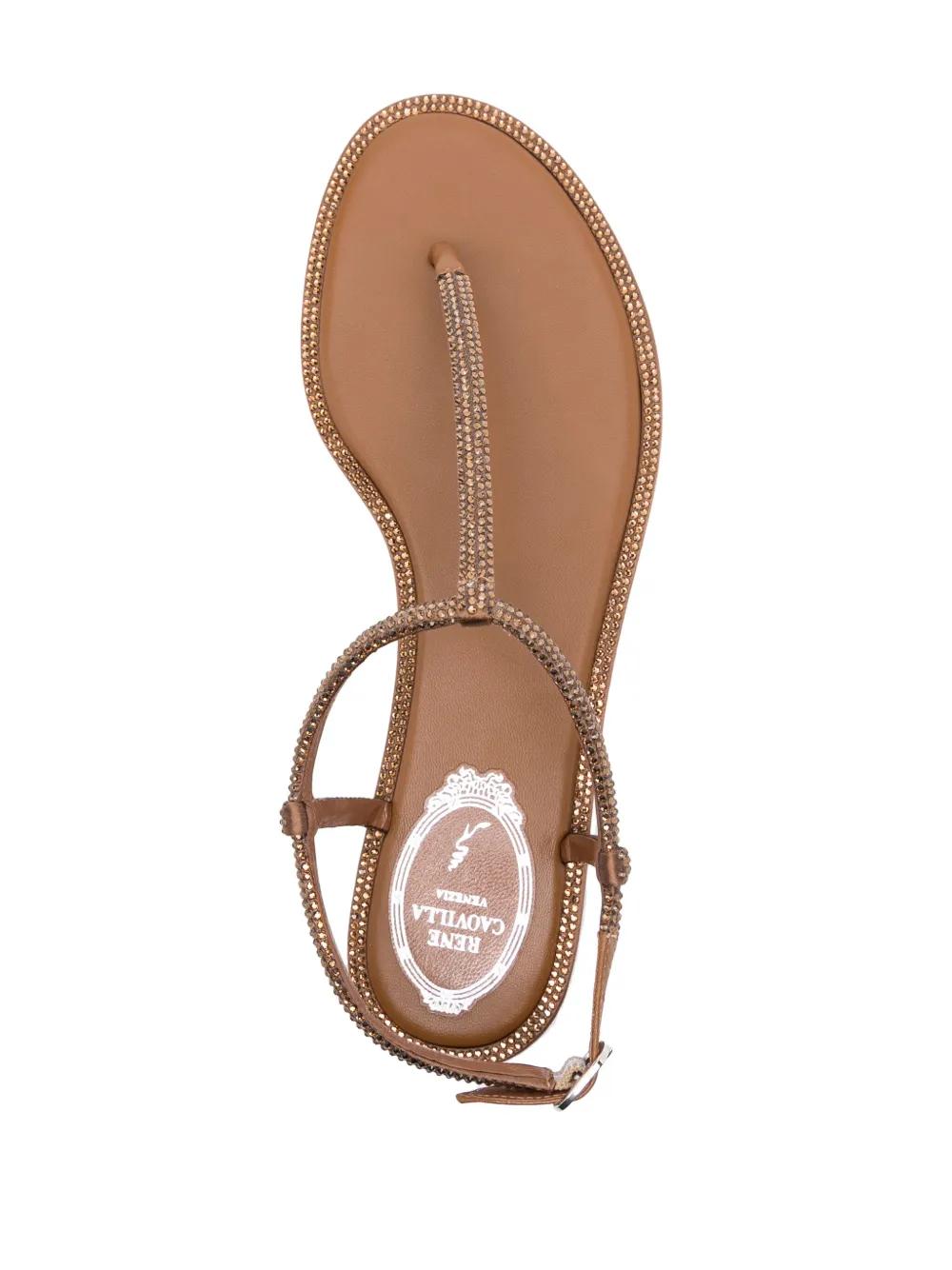 tobacco brown calf leather smooth grain glass crystal embellishment round open toe thong strap buckle-fastening ankle strap branded leather footbed flat rubber sole