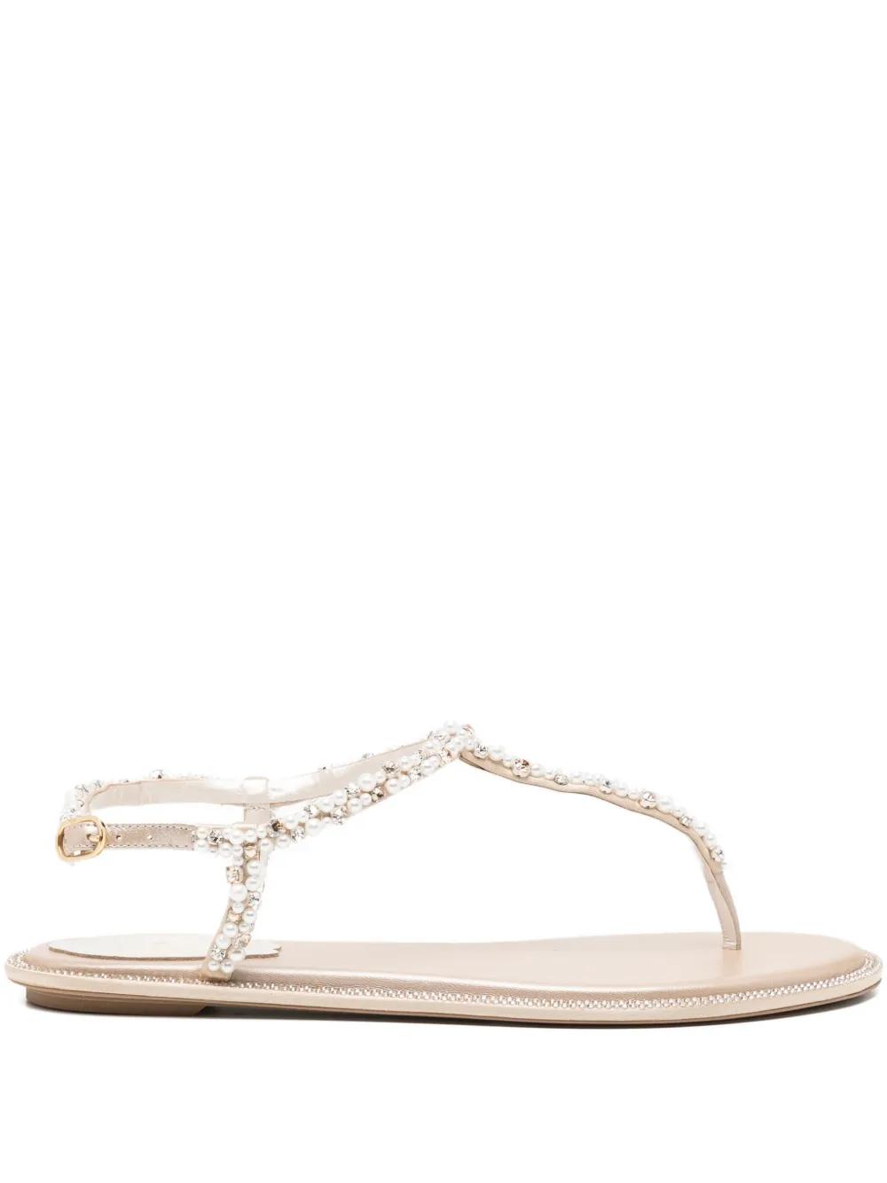 beige pearl embellishment crystal embellishment t-strap buckle fastening flat sole
