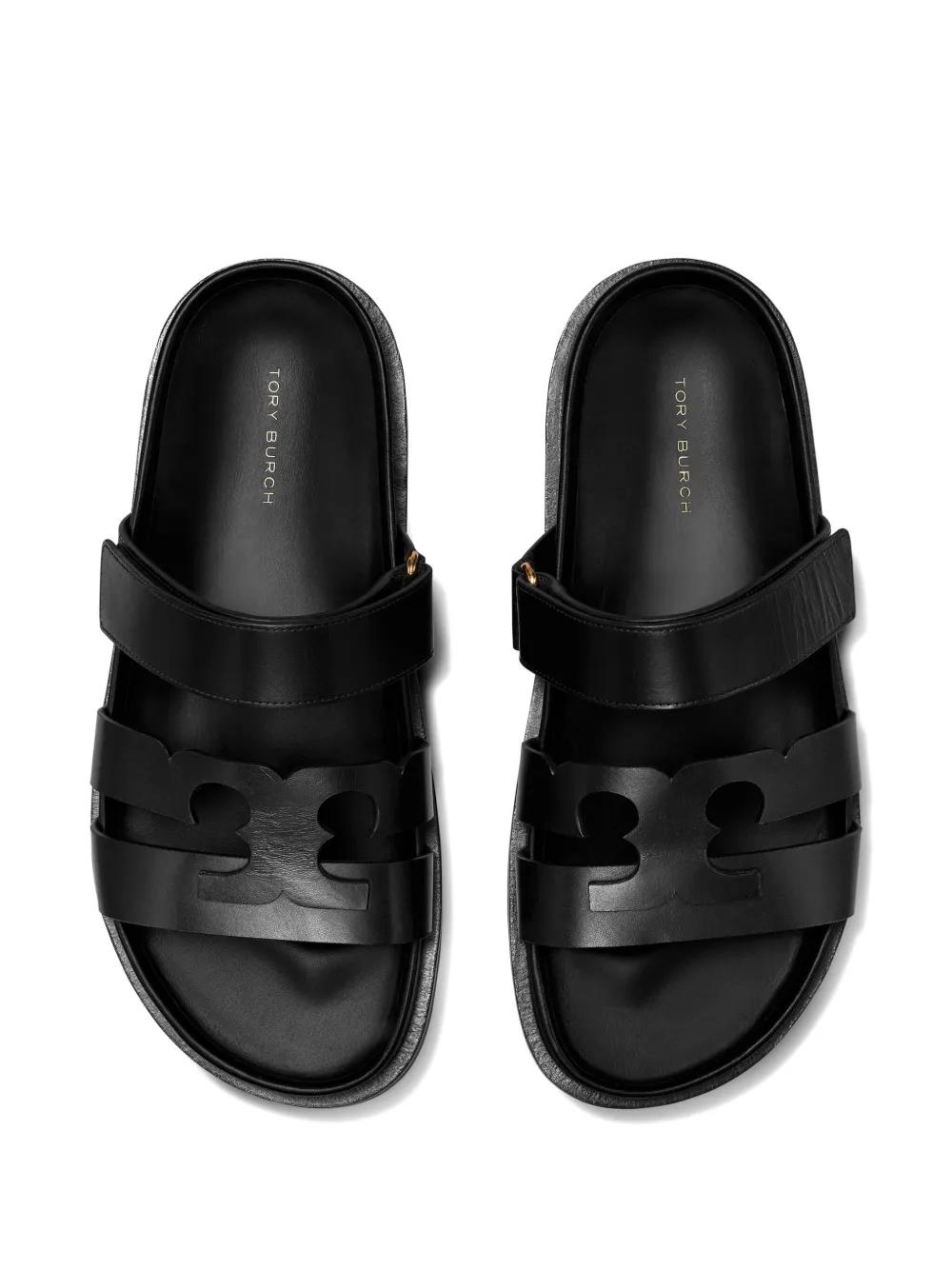 black slip-on style touch-strap fastening appliqué logo flat rubber sole