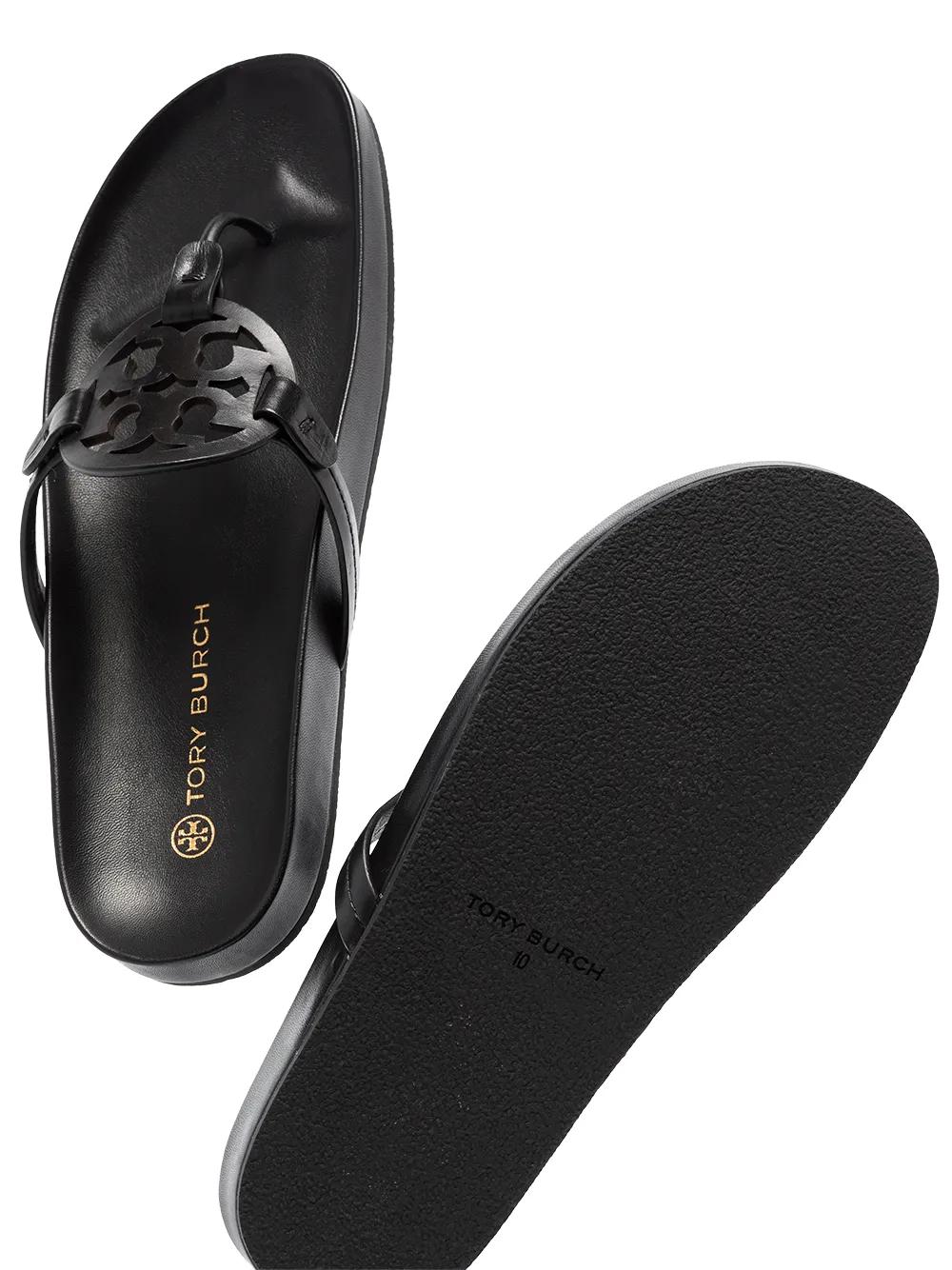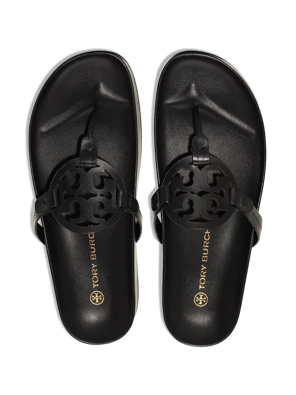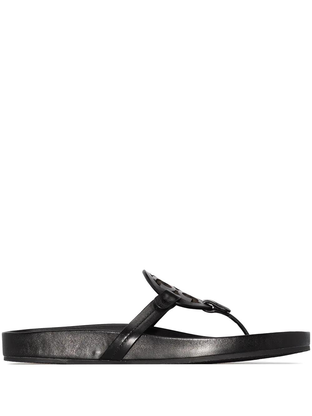 black leather monogram plaque T-strap to the front open toe branded leather insole flat rubber sole