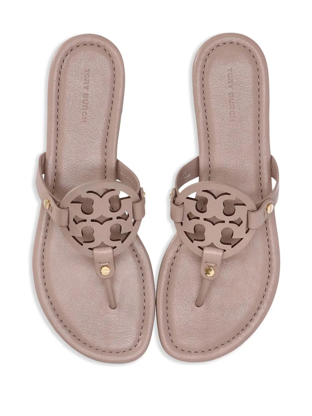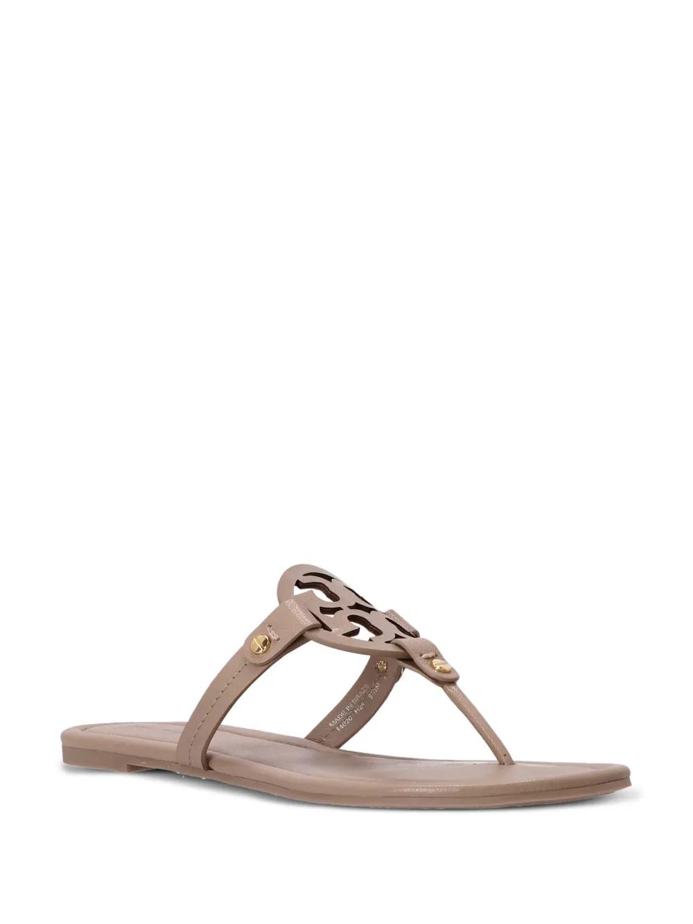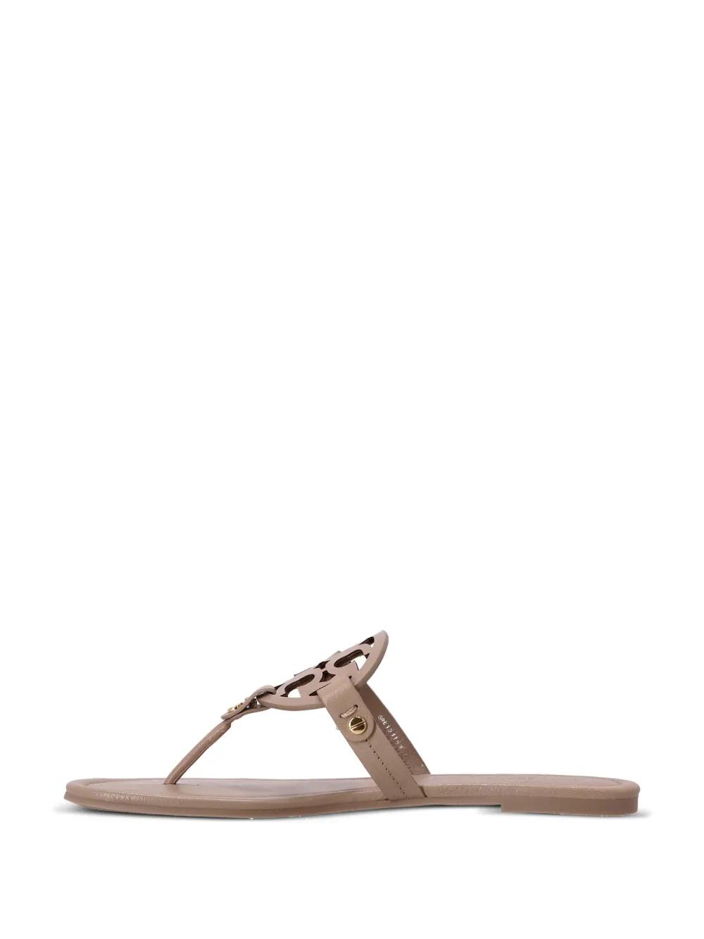 brown leather slip-on style flat rubber sole signature Double T motif gold-tone stud detailing thong strap round open toe