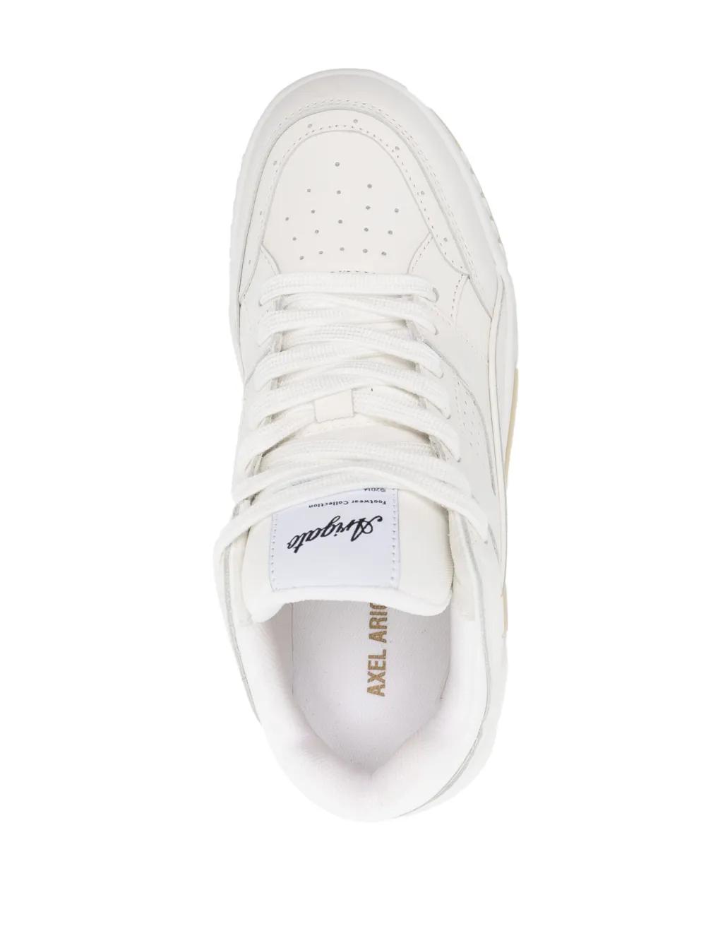white calf leather panelled design perforated detailing logo print to the side front lace-up fastening chunky rubber sole