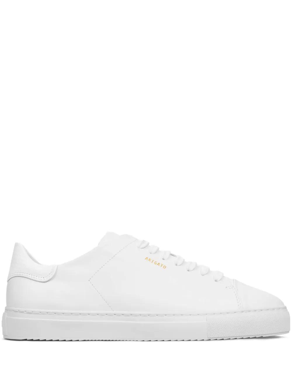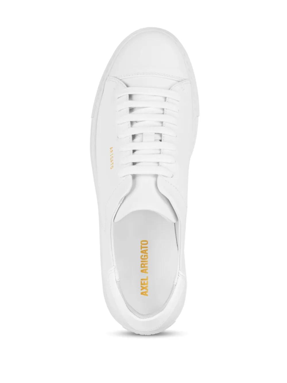 white leather smooth grain logo print to the side heel counter decorative stitching round toe front lace-up fastening branded insole flat rubber sole