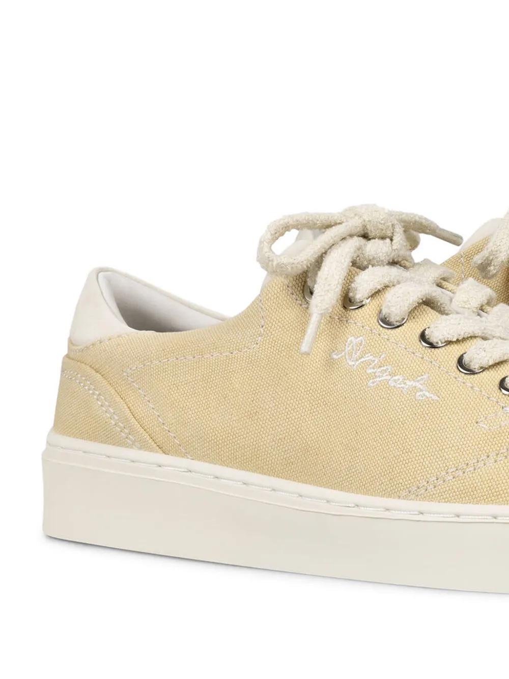 beige/off-white cotton blend/nubuck leather panelled design front lace-up fastening embroidered logo to the side contrasting heel counter round toe flat partly recycled sole