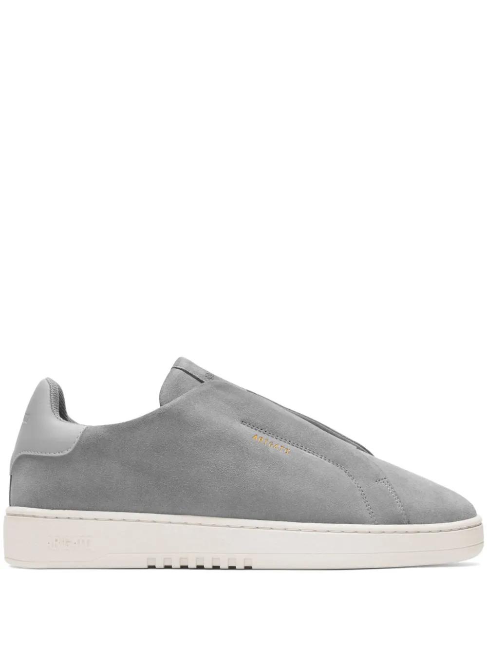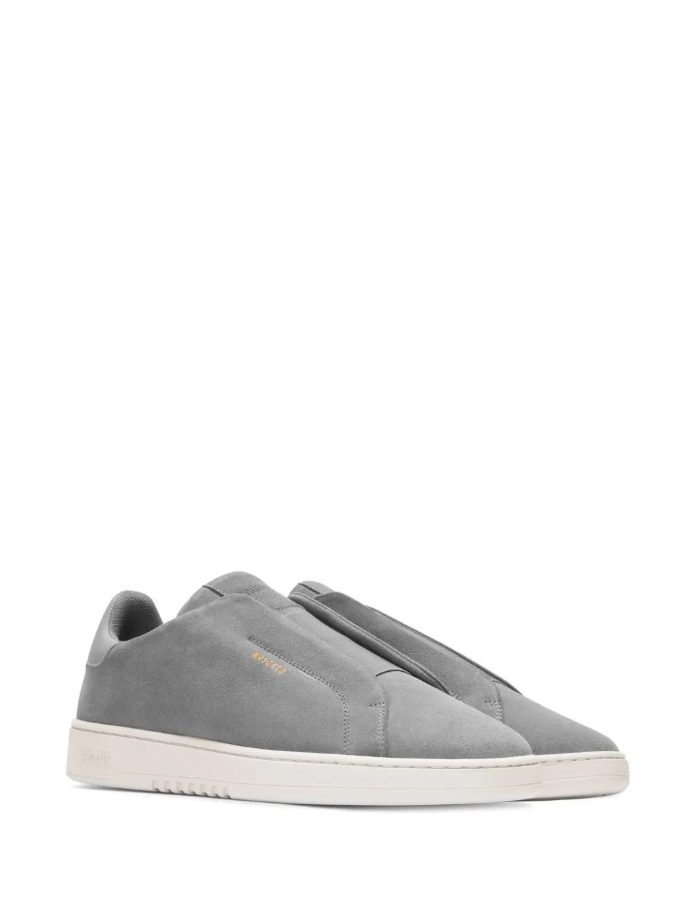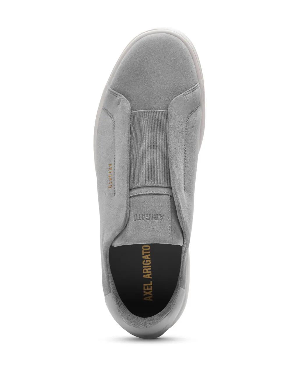 ash grey suede laceless design logo patch at the tongue logo stamp at side branded heel counter round toe elasticated band branded insole flatform sole