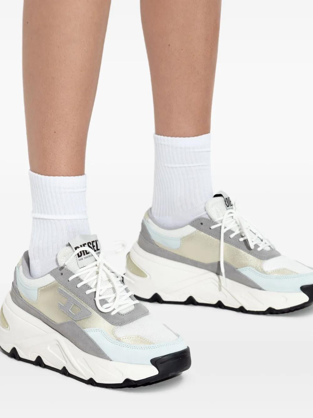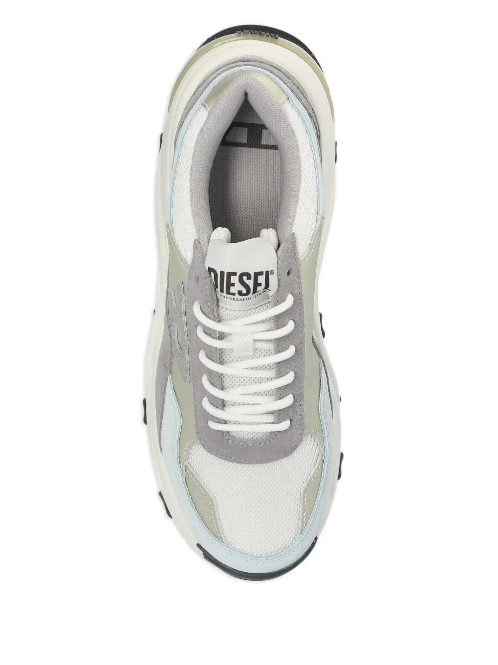 light grey suede panelling mesh panelling lace-up fastening chunky rubber sole logo detail