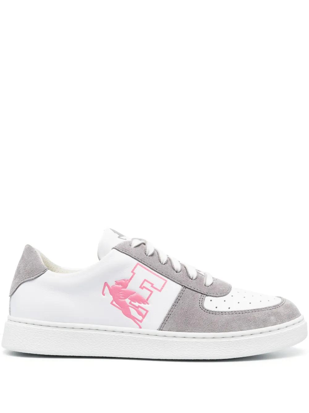 white/grey calf leather suede panels signature Pegaso motif perforated toebox front lace-up fastening logo-print tongue branded insole rubber sole
