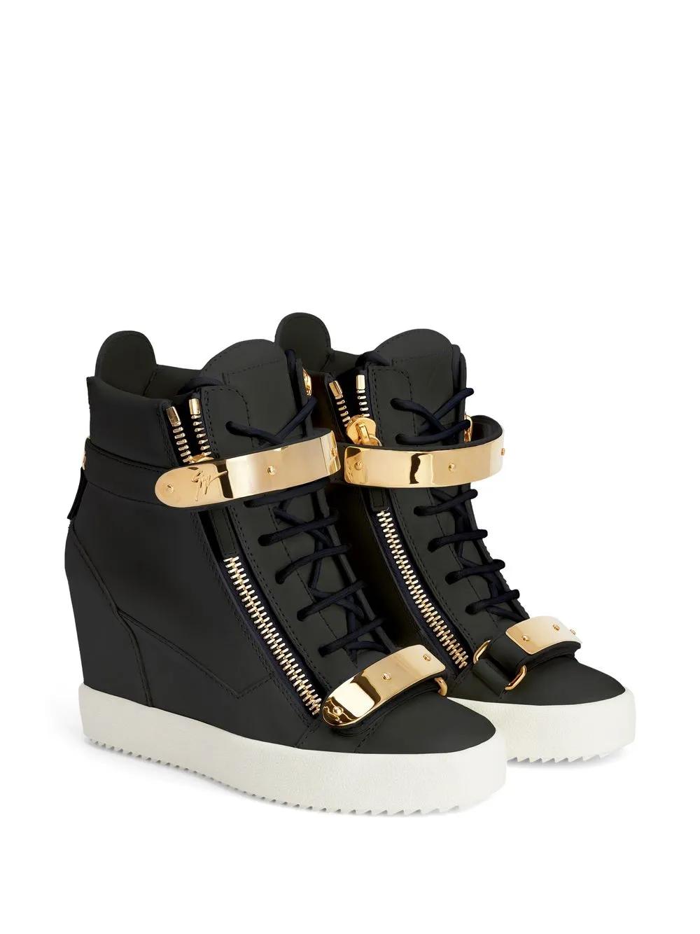 Coby 75mm wedge-heel sneakers from Giuseppe Zanotti featuring white, leather, gold-tone hardware, almond toe, front lace-up fastening, front touch-strap fastening, decorative zip detailing, ankle-length and 75mm wedge heel.