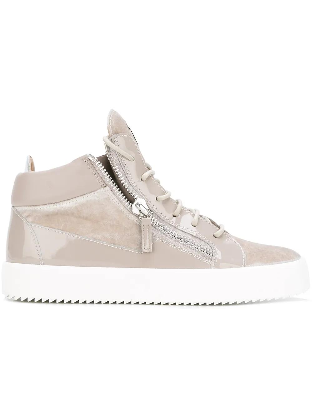 Nude leather and silk velvet Kriss hi-top sneakers from Giuseppe Zanotti featuring a round toe, a lace fastening, side zip fastenings, a logo patch at the tongue and a white rubber sole.