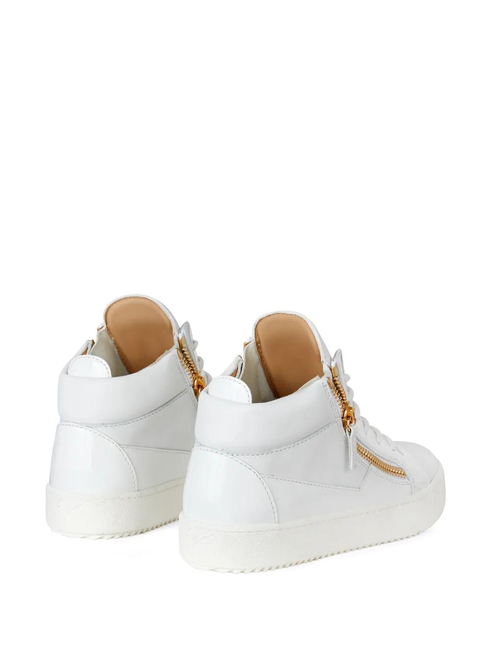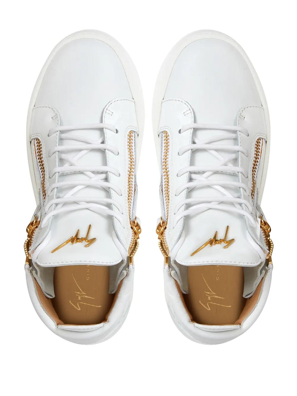 white leather/patent leather gold-tone hardware logo patch at the tongue ankle-length front lace-up fastening side zip fastening branded insole flat rubber sole