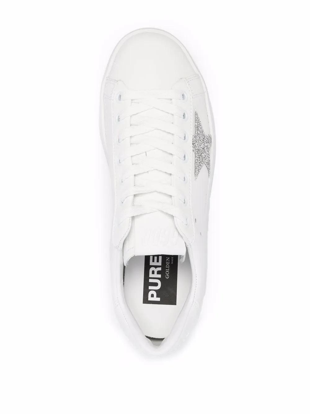 white leather signature star patch to the sides glitter detailing round toe front lace-up fastening perforated detailing branded heel counter logo patch at the tongue branded insole flat rubber sole