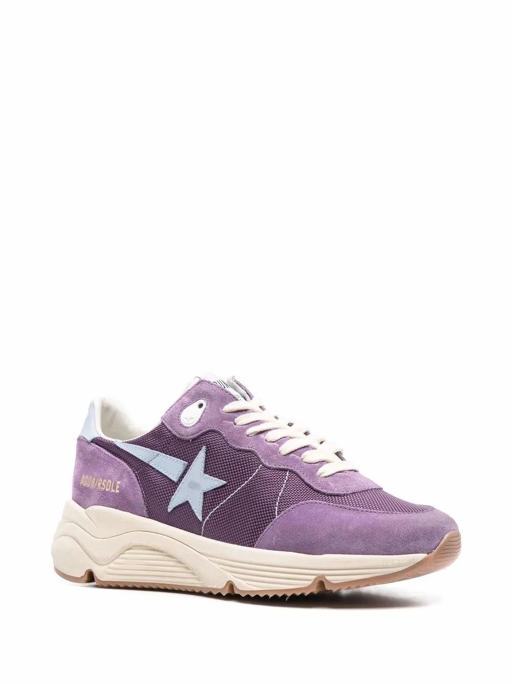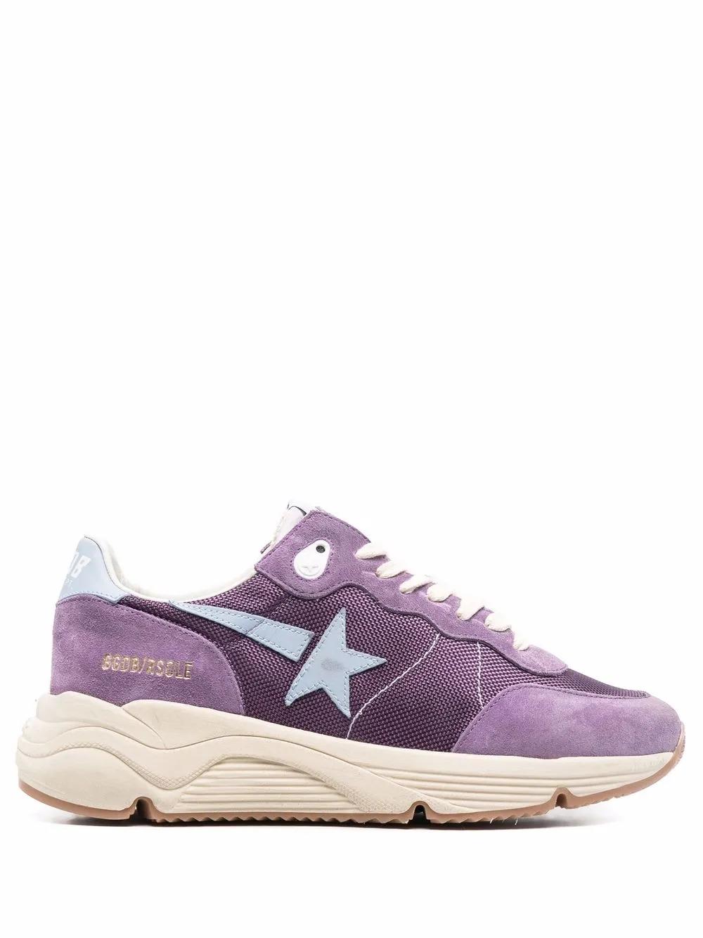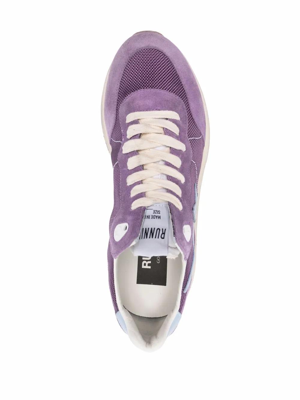 mauve purple/sky blue calf suede panelled design signature star patch to the sides logo print to the rear logo patch at the tongue almond toe front lace-up fastening branded insole chunky rubber sole