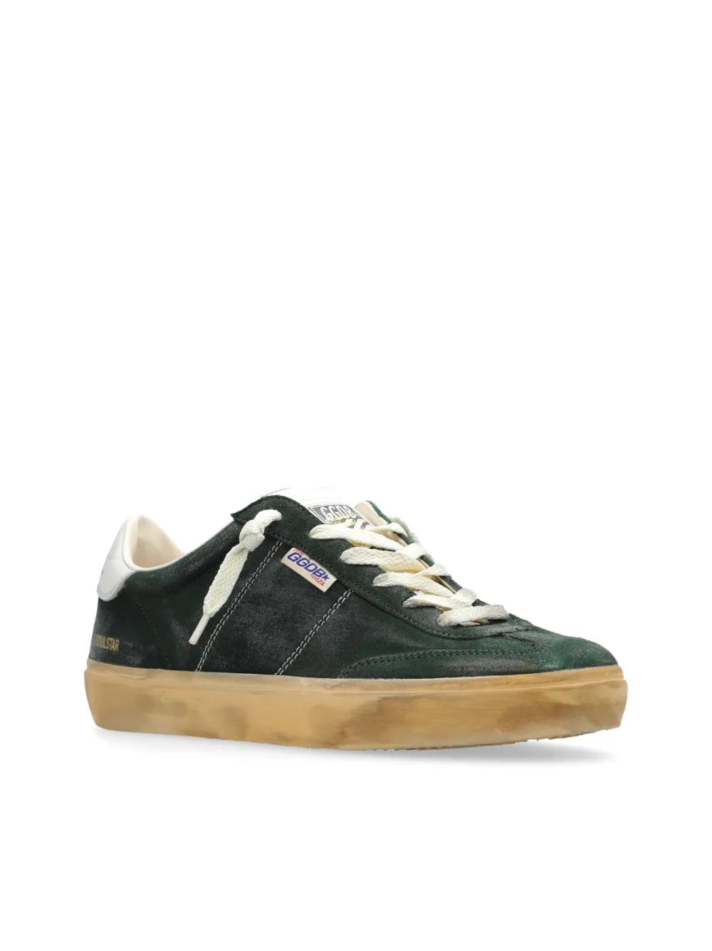 green leather front lace-up fastening branded insole logo patch at the tongue rubber sole round toe