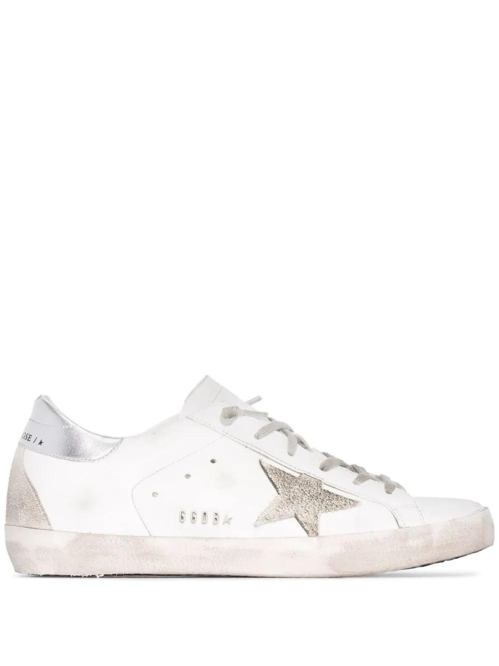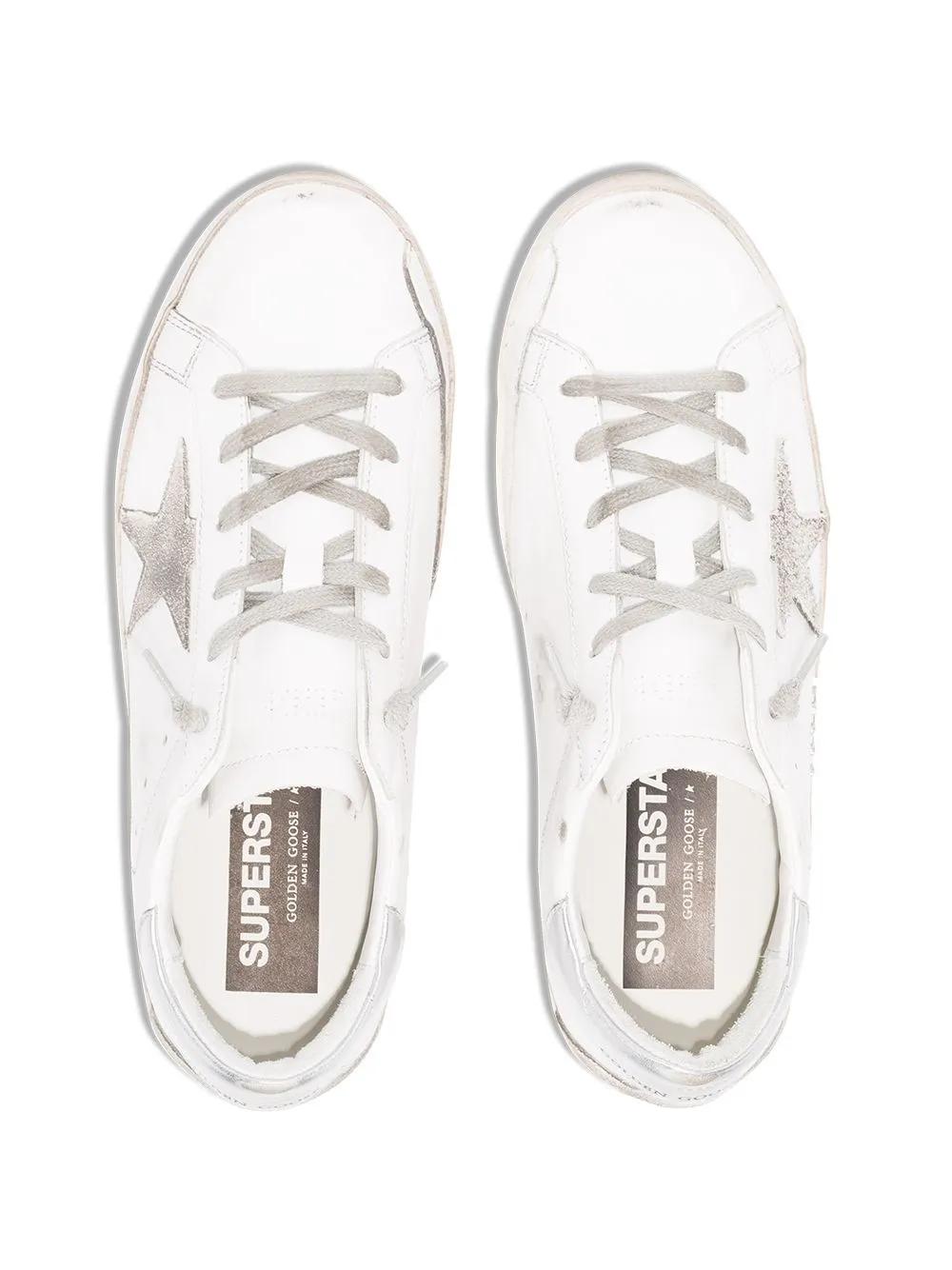 white/silver-tone leather signature star patch to the sides contrasting panel detail distressed effect round toe front lace-up fastening perforated detailing logo plaque flat sole
