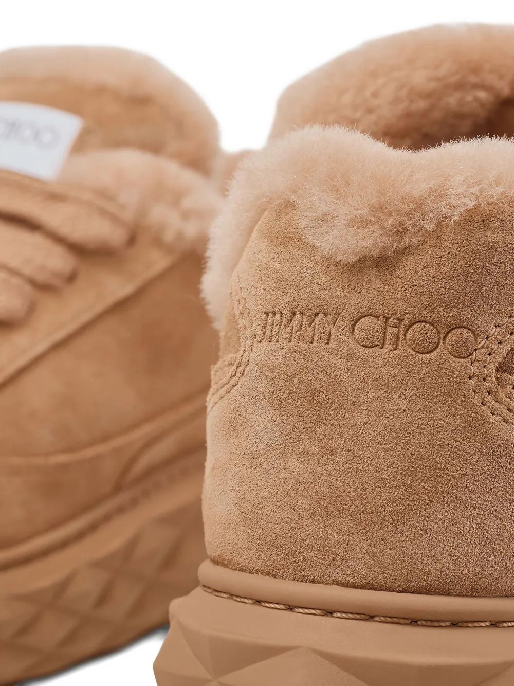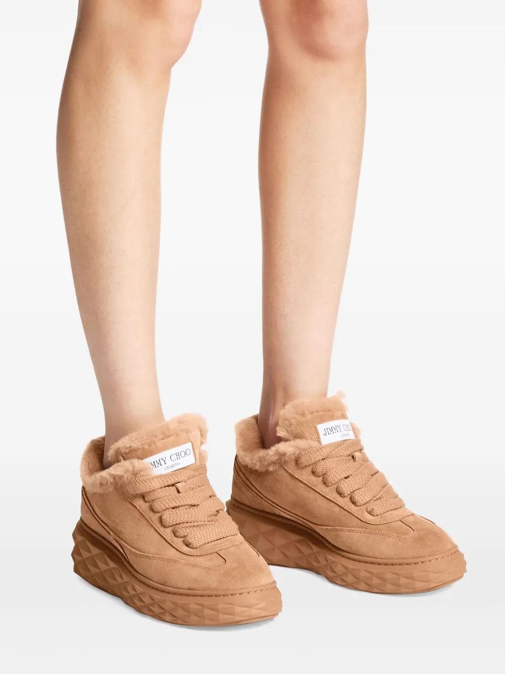 toffee brown shearling trim lace-up fastening rubber sole diamond pattern logo patch on the tongue