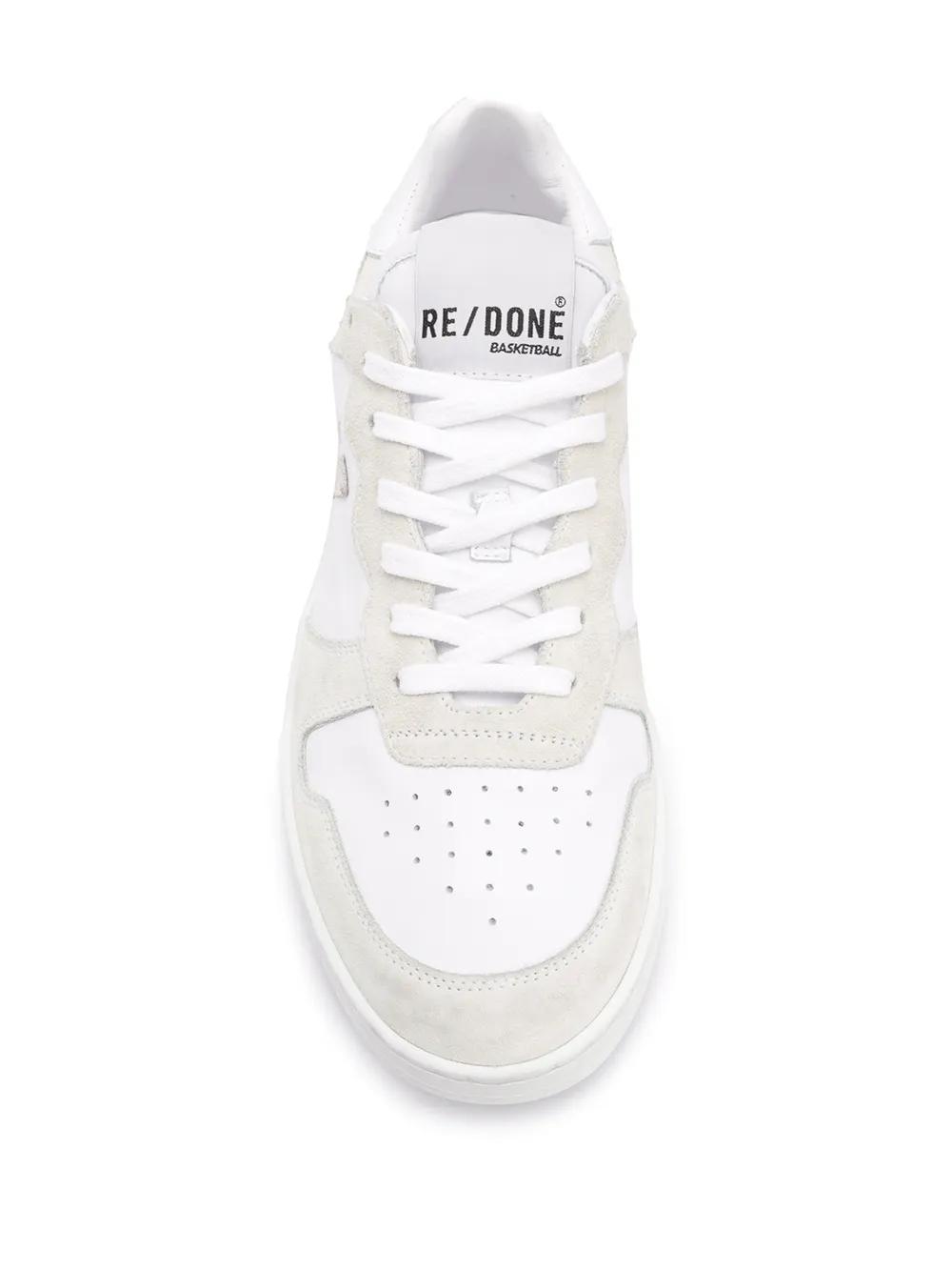 White and beige leather two-tone low top sneakers from RE/DONE featuring suede panels, a perforated detail, a round toe, a lace-up front fastening, a logo patch at the tongue, a branded insole and a flat rubber sole.