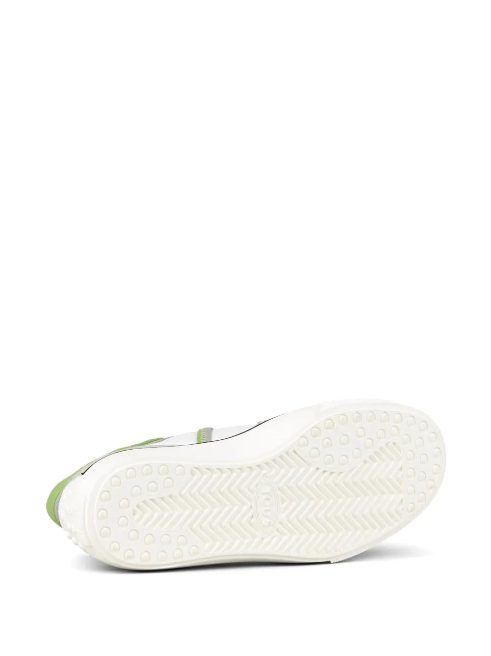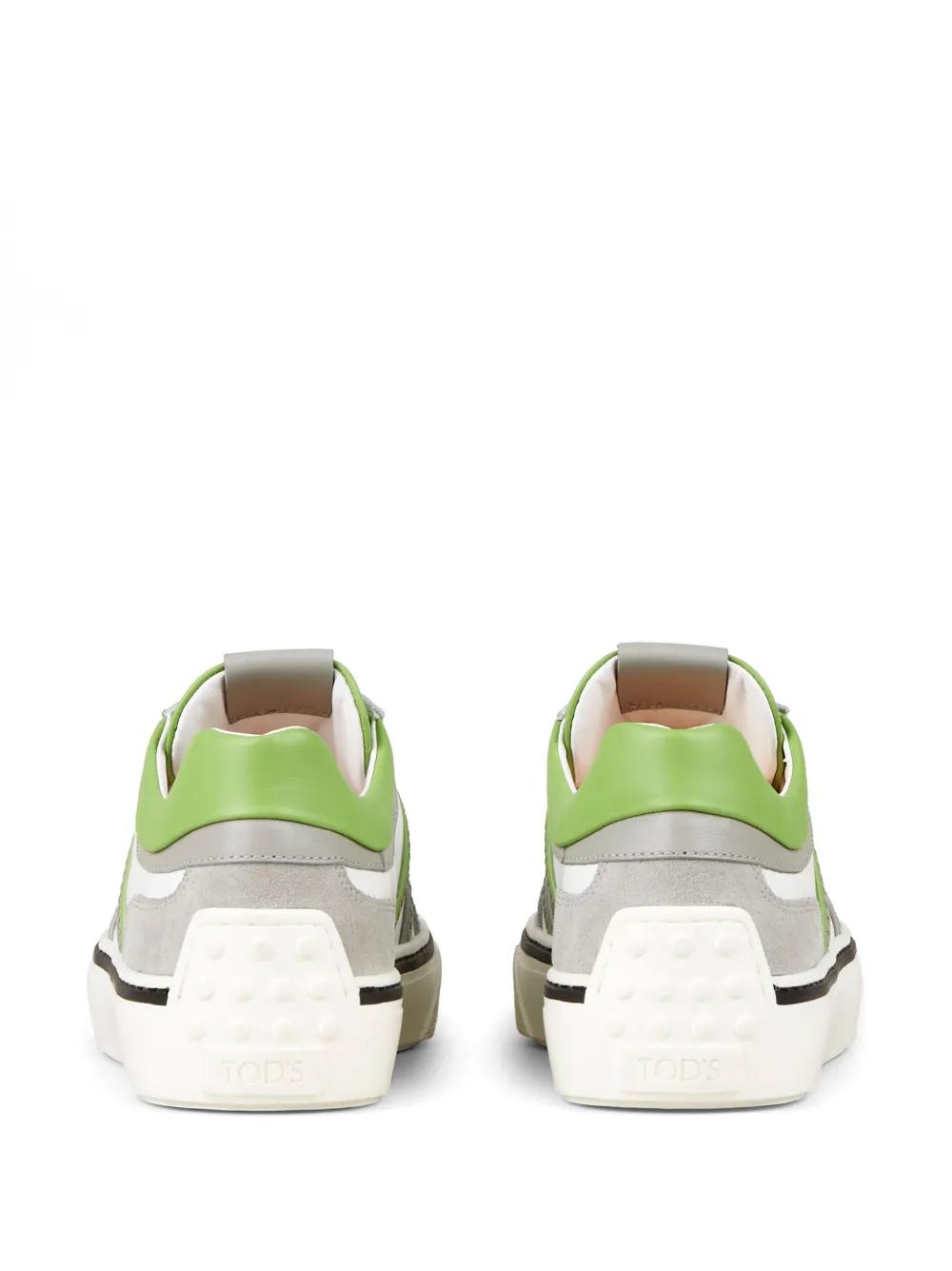 white/grey/bright green lambskin/calf suede colour-block panelled design logo-debossed tongue logo plaque logo at the sole round toe front lace-up fastening branded insole flat rubber sole