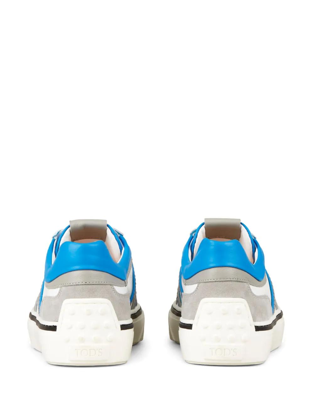 white/grey/blue lambskin/calf suede colour-block panelled design logo-debossed tongue logo plaque logo at the sole round toe front lace-up fastening branded insole flat rubber sole