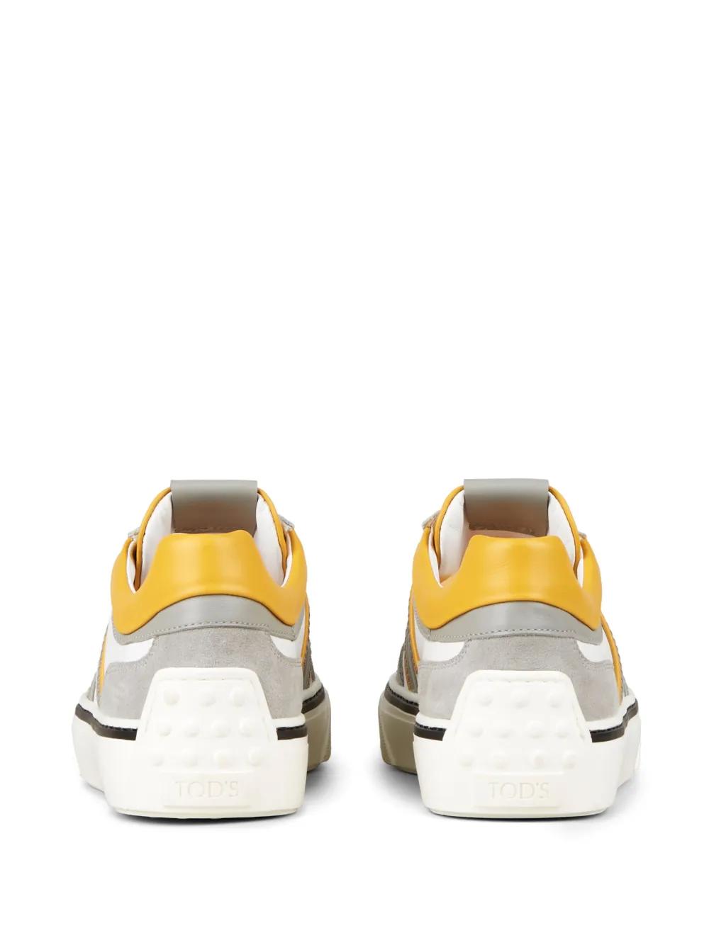 white/grey/orange lambskin/calf suede colour-block panelled design logo-debossed tongue logo plaque logo at the sole round toe front lace-up fastening branded insole flat rubber sole