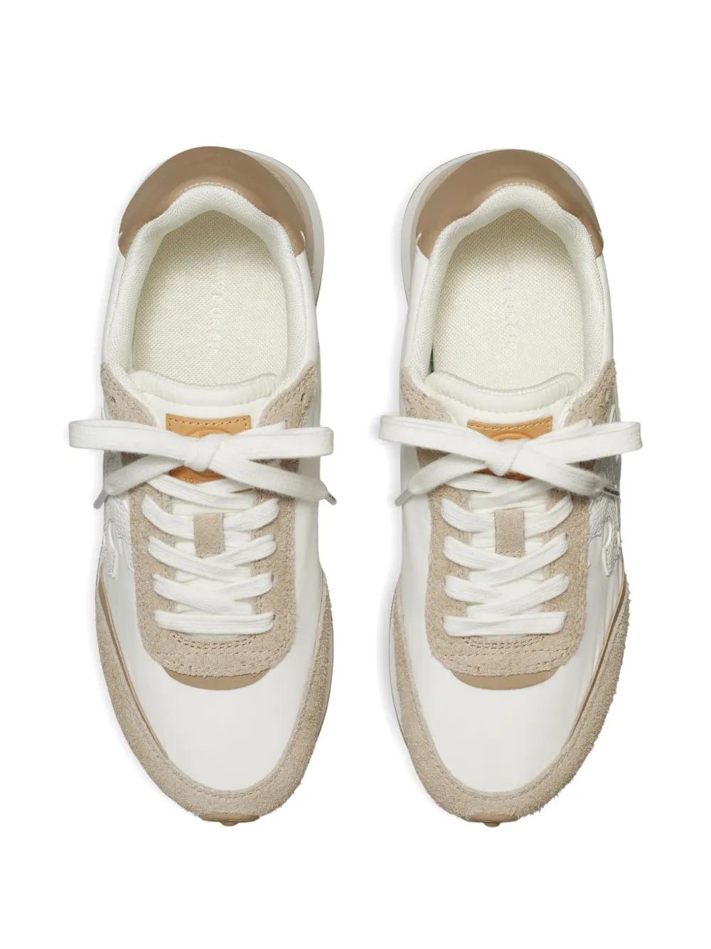 cream white lace-up design perforated detailing suede panels contrasting heel counter logo embroidery