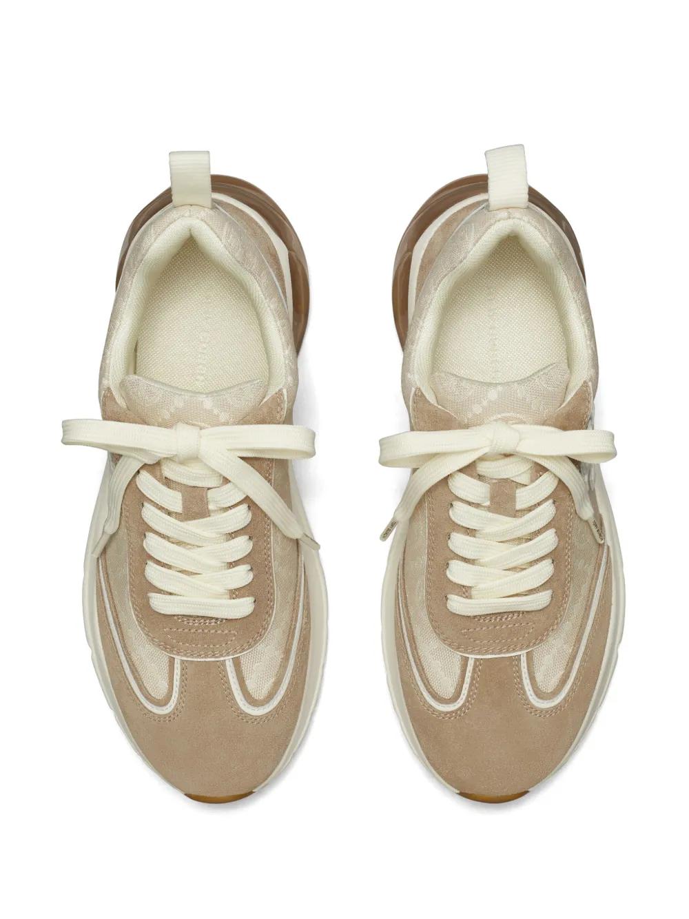 sand beige/light beige canvas/leather suede panelling colour-block panelled design signature Double T motif monogram pattern round toe front lace-up fastening double pull-tab at the opening mesh lining branded insole rubber lug sole