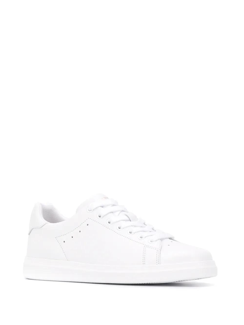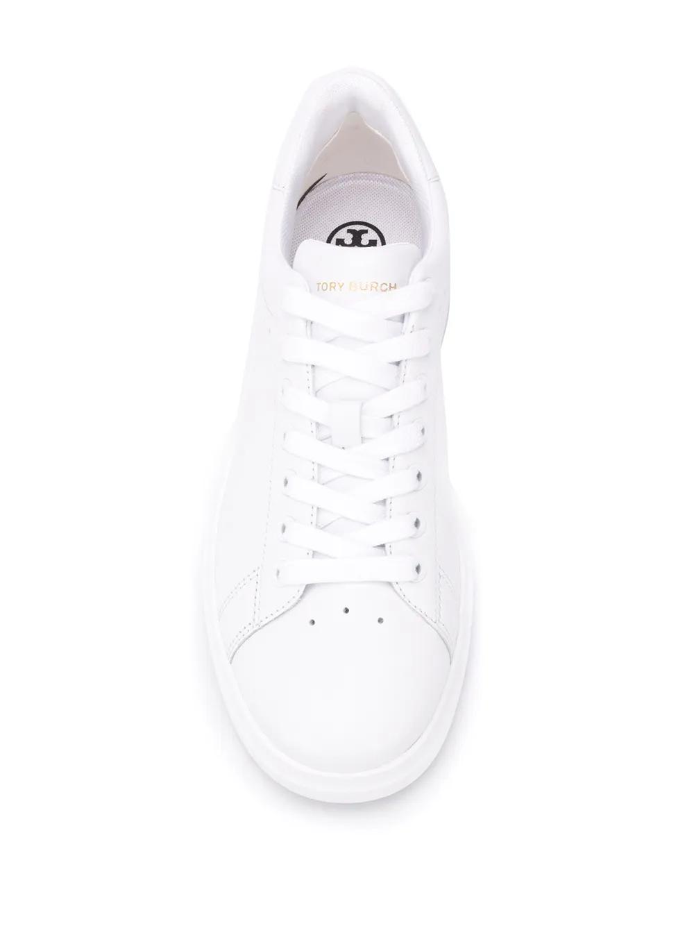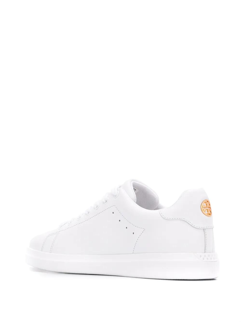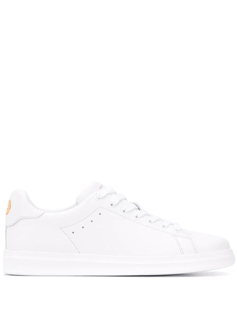 White leather low-top sneakers from Tory Burch featuring an almond toe, a lace fastening, a brand embossed tongue, a branded insole, rear logo plaque and a flat rubber sole.