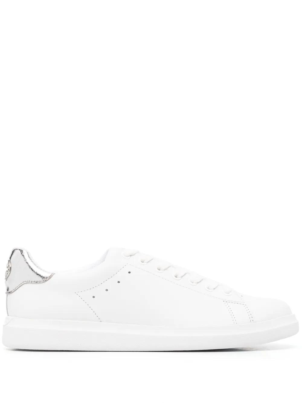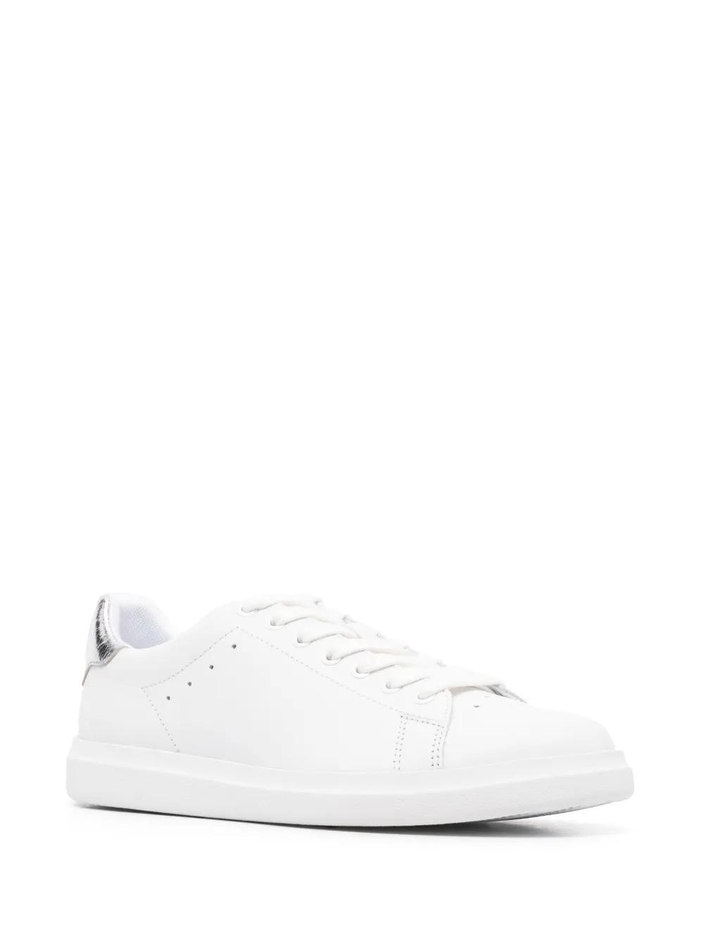 white bovine leather/calf leather logo plaque at the heel metallic heel counter round toe front lace-up fastening branded insole flat rubber sole