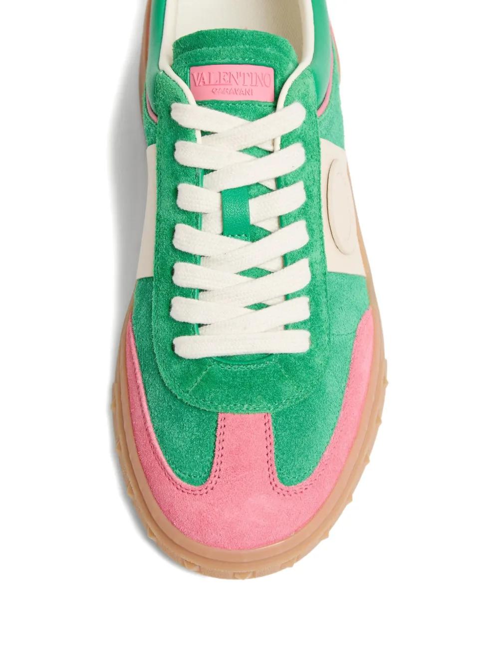 green/pink/white calf suede panelled design front lace-up fastening heel counter side stripe detailing VLogo Signature round toe branded leather insole vulcanised-rubber sole