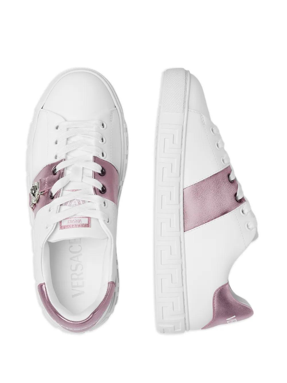 white lilac heel front lace-up fastening flat sole topstitching brand lettering