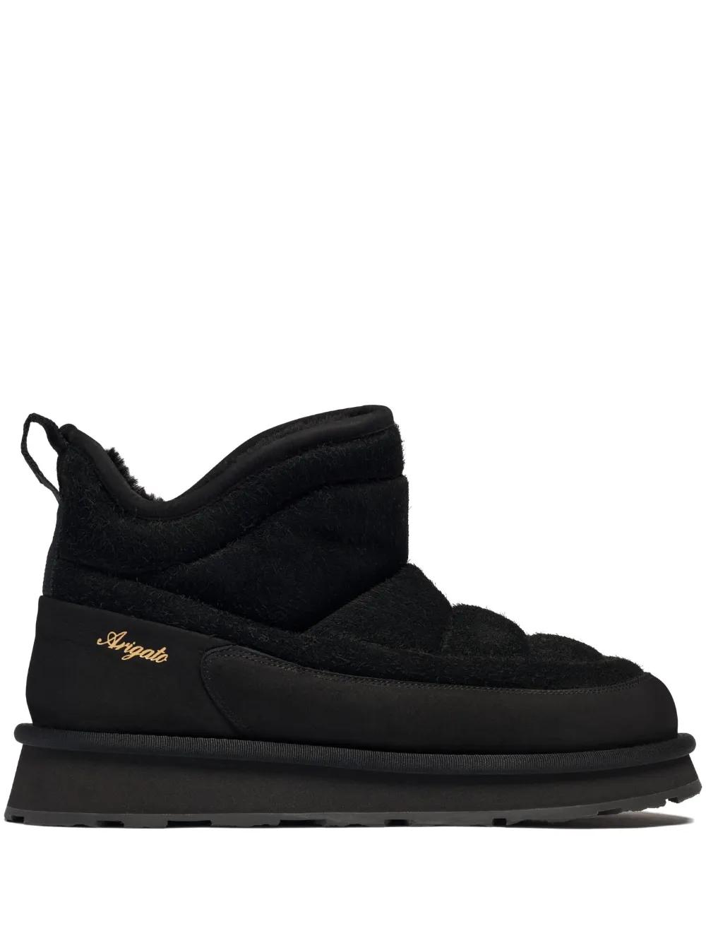 black leather padded design pull-on style pull-tab at the heel embroidered logo to the rear logo stamp at side round toe shearling lining chunky sole