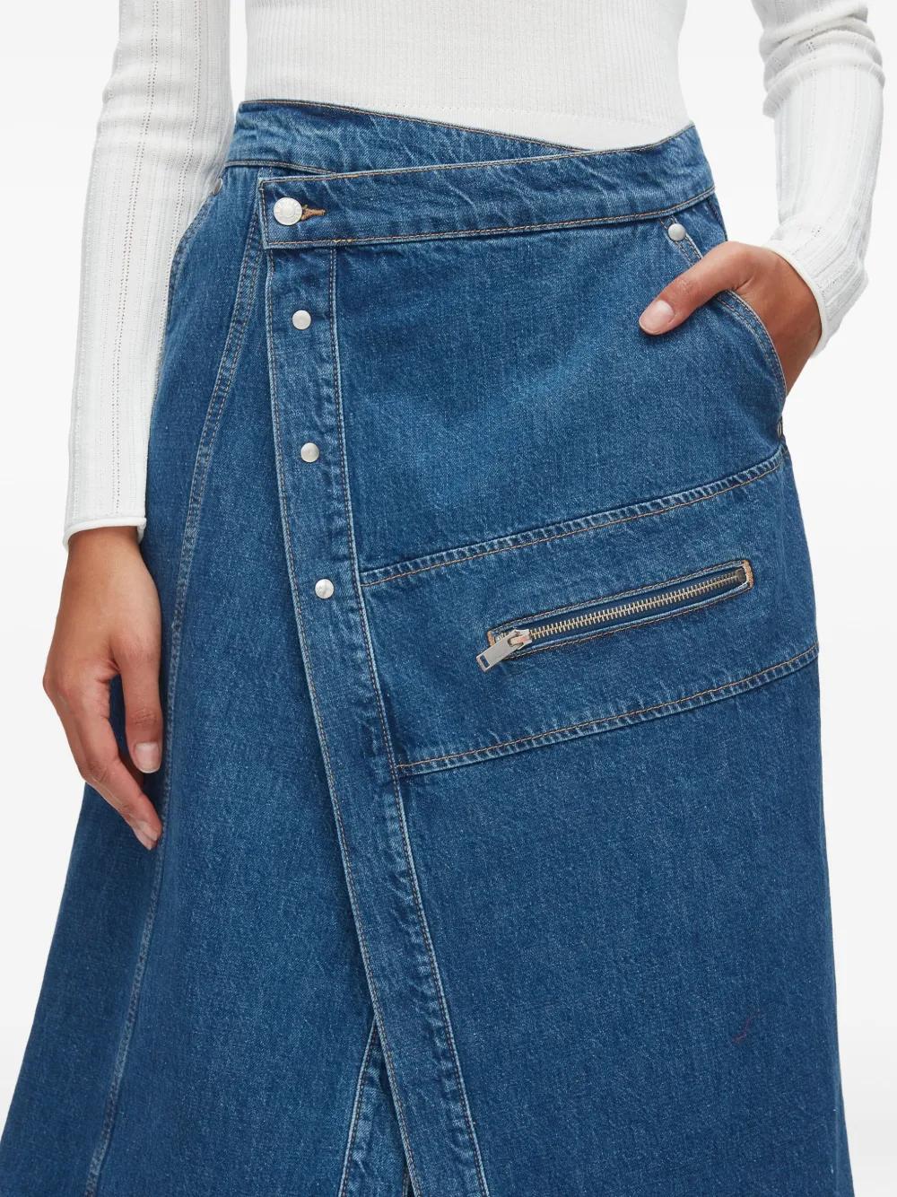 indigo blue cotton front zipped pocket button fastening panelled design asymmetric hem