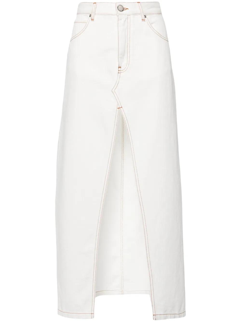 white cotton denim contrast stitching metal eyelet detailing embroidered design to the rear logo patch to the rear belt loops front button and zip fastening classic five pockets front slit straight hem
