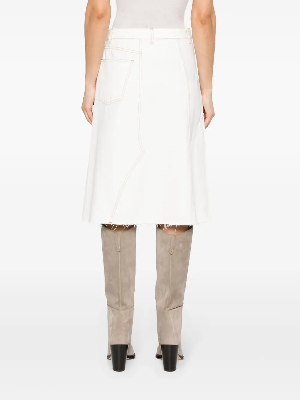 white denim contrast stitching belt loops side slit pocket side patch pocket decorative slit detailing to the front rear patch pocket A-line raw-cut hem concealed fly and button fastening