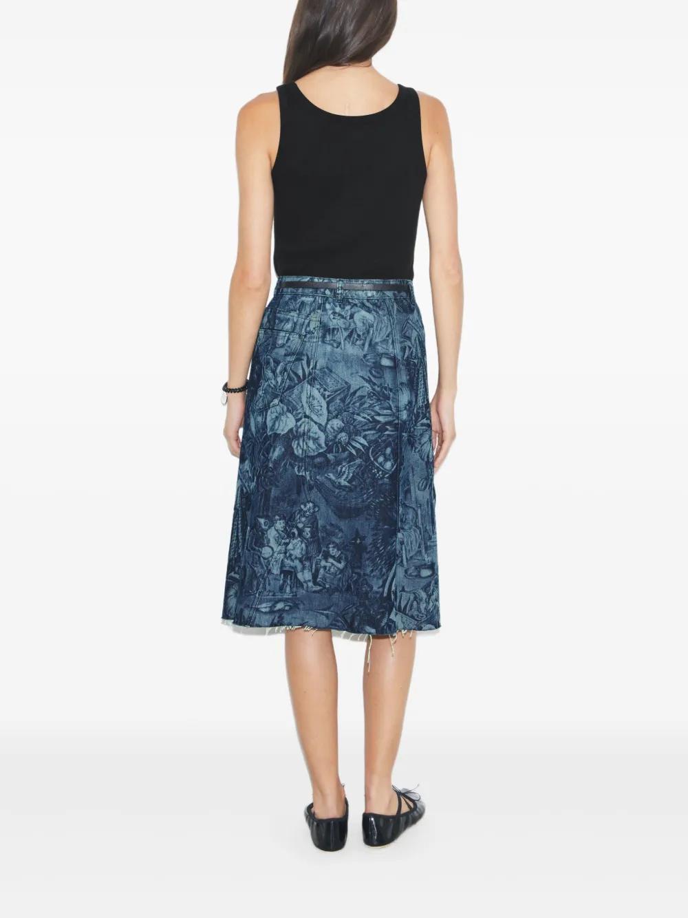 indigo blue frayed hem all-over print a-line shape belted waist button fastening